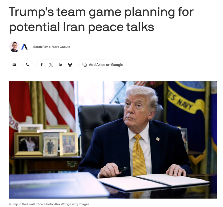 △美国政治新闻媒体Axios报道,特朗普政府已开始就下一阶段以及与伊朗和平谈判可能的形式进行初步讨论。