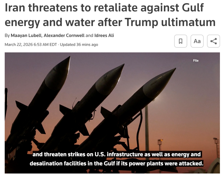 △路透社报道,特朗普发出最后通牒后,伊朗威胁将对海湾地区的能源和水源进行报复。