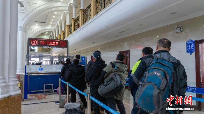3月24日,内蒙古新巴尔虎右旗,阿日哈沙特口岸旅检大厅内,旅客们有序排队等候过检。 田昊霖 摄