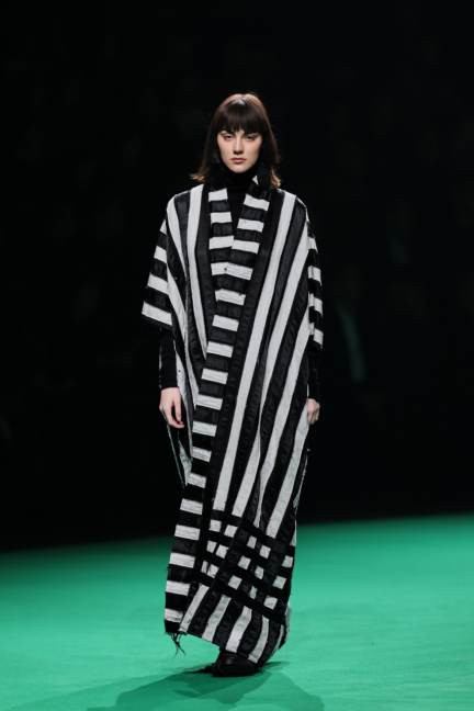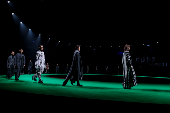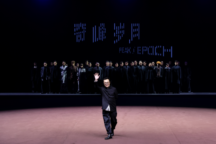 在秀场呈现上,本次大秀共倾情释出了50套精心打磨的成衣作品,并以流畅的叙事逻辑自然过渡为三个各具特色又内在统一的篇章。在开篇的第一系列中,设计重点聚焦于经典轮廓的解构与重组,致敬上世纪知识分子穿衣风格,初显时代先锋气质;随后步入的第二系列,则进一步展现了东西方元素的深度交融与轻运动风格的碰撞,结合传统工艺,凸显手工温度;而在第三系列里,结合中式风格和3D打印面料,服装的结构张力达到极致,完美表达了内外层次的极致穿插。通过层次分明的递进,整场秀演生动构建了一个跨越时空的宏大美学空间。