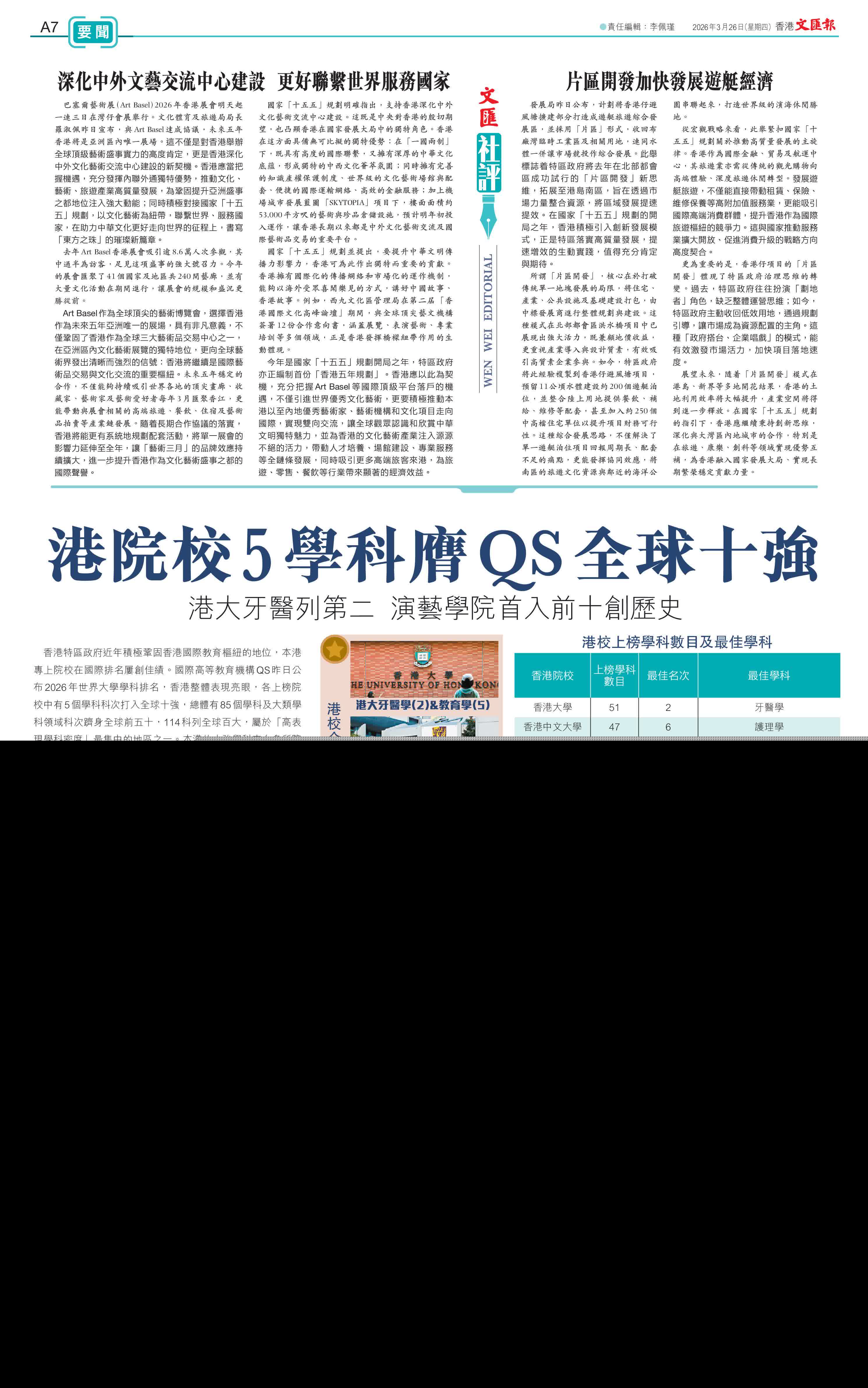 (香港文匯報記者 莫楠)香港特區政府近年積極鞏固香港國際教育樞紐的地位,本港專上院校在國際排名屢創佳績。國際高等教育機構QS昨日公布2026年世界大學學科排名,香港整體表現亮眼,各上榜院校中有5個學科科次打入全球十強,總體有85個學科及大類學科領域科次躋身全球前五十,114科列全球百大,屬於「高表現學科密度」最集中的地區之一。本港的十強學科來自多所院校,尤以香港大學牙醫學排全球第二最為頂尖,而香港演藝學院的表演藝術也首次打入全球前十排第十位,其餘包括教育學與護理學等不同範疇,反映香港高等教育體系多元並進、百花齊放。