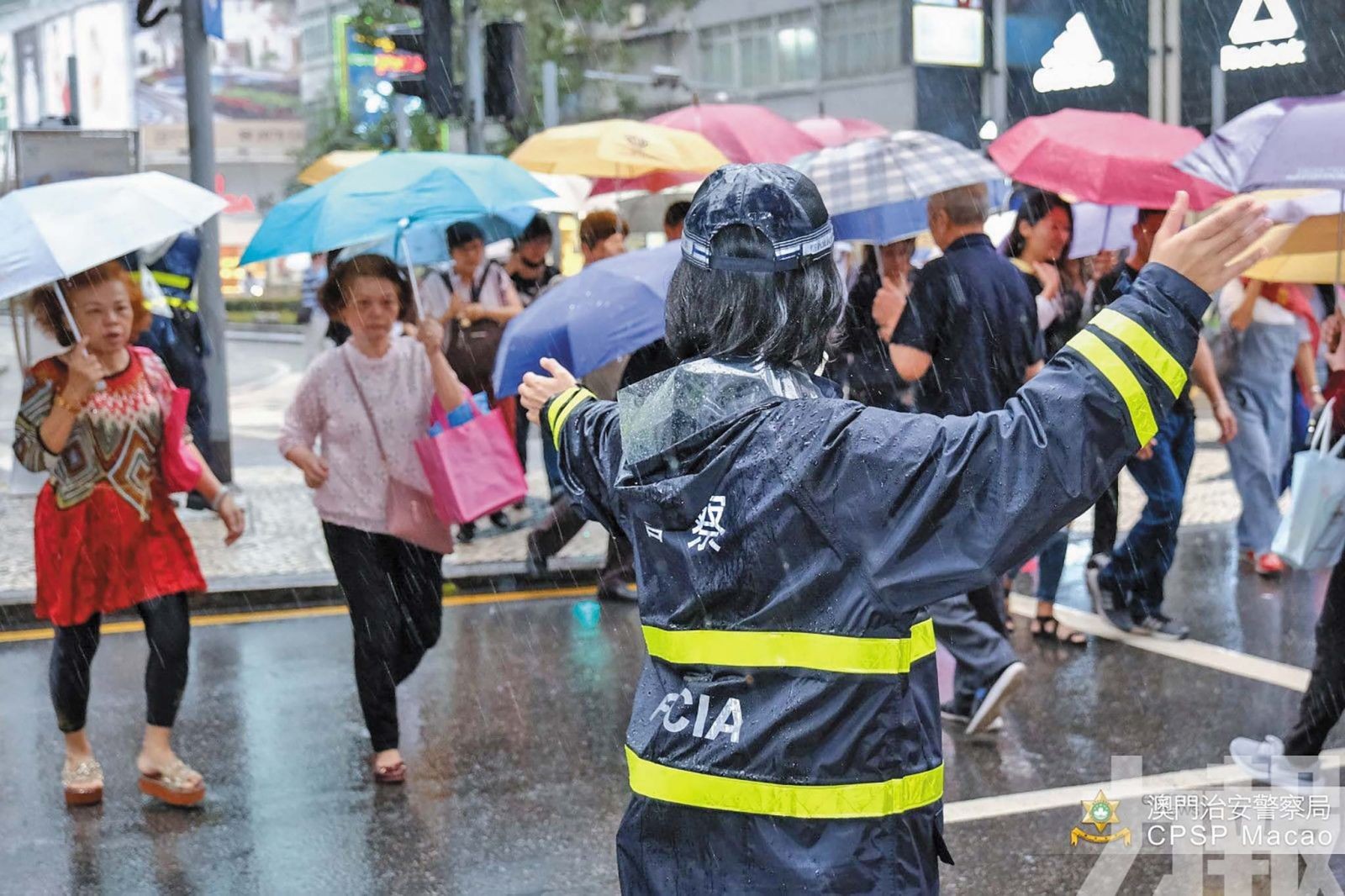 2019年復活節期間澳門警員在雨中疏導人流。(澳門治安警察局圖片)