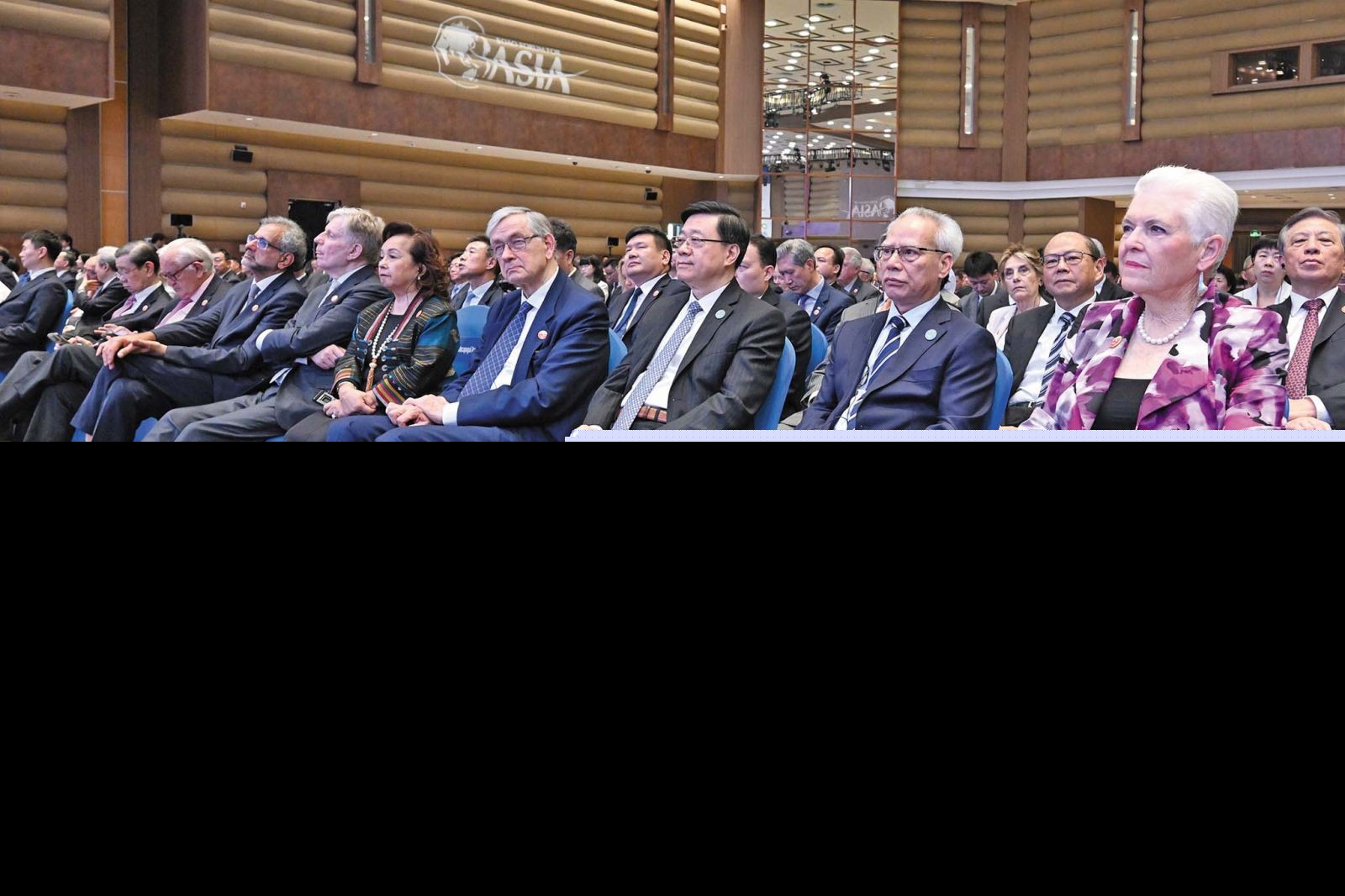 行政長官岑浩輝出席博鰲亞洲論壇2026年年會全體大會,聆聽中共中央政治局常委、全國人大常委會委員長趙樂際發表的主旨演講。(新聞局圖片)