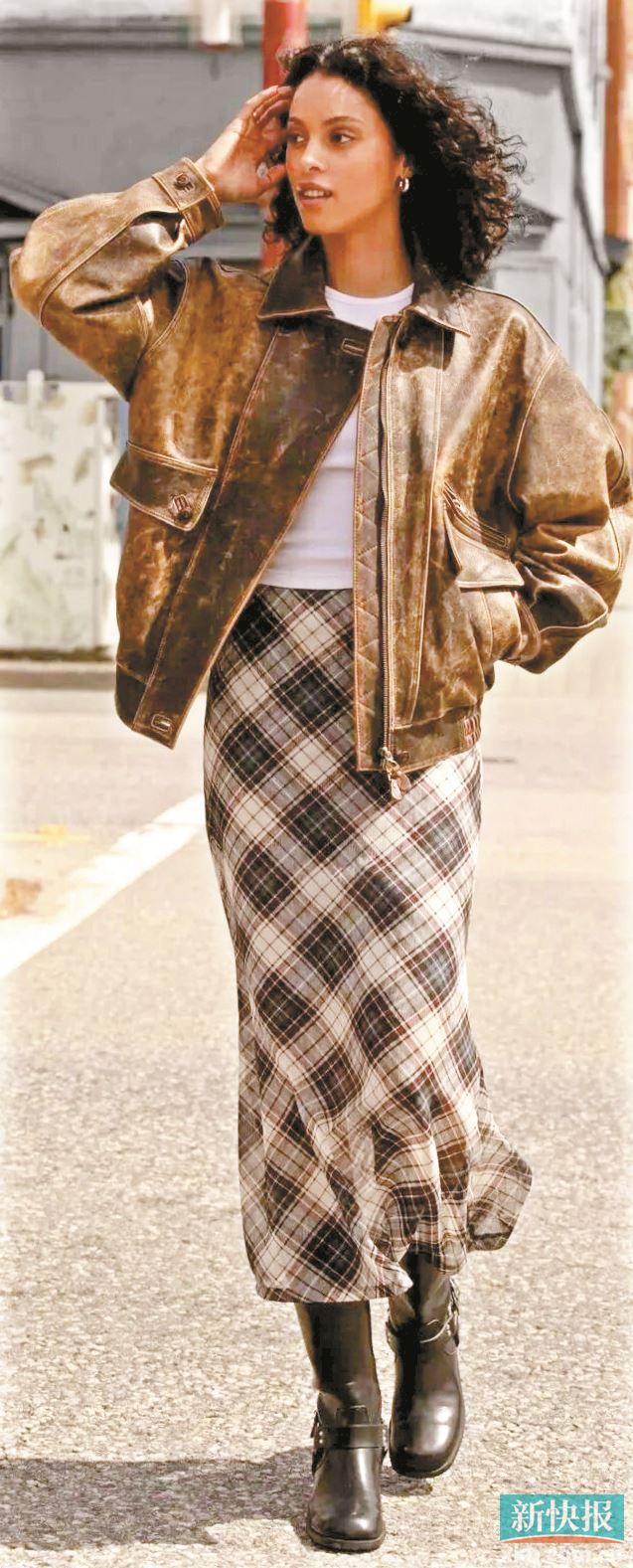 这组搭配的核心是“突出腰线”,夹克长度不过腰,内搭以简约基础款为主。腰粗胯宽的时髦精可选侧面有拼接设计或微弹材质的包臀短裙,搭宽松一点的短款夹克,可适当修饰身形。