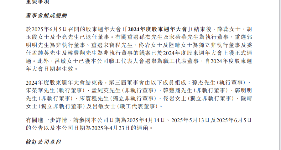 公告披露,在2025年6月5日召开的股东周年大会后,薛蕊、胡玉霞及李亮已退任董事。孙杰、宋荣华担任执行董事,吕敏获选为职工代表董事。