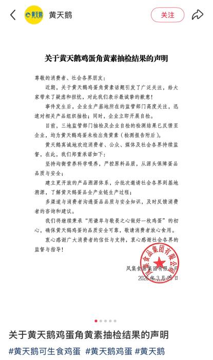 3月25日,黄天鹅发布角黄素抽检结果声明并附检测报告。声明称,事件发生后,企业生产基地所在的监管部门高度关注,迅速对相关产品组织抽检,企业同步开展自检。目前,三地监管部门抽检及企业自检的检测结果已反馈至企业,均为黄天鹅鸡蛋未检出角黄素。