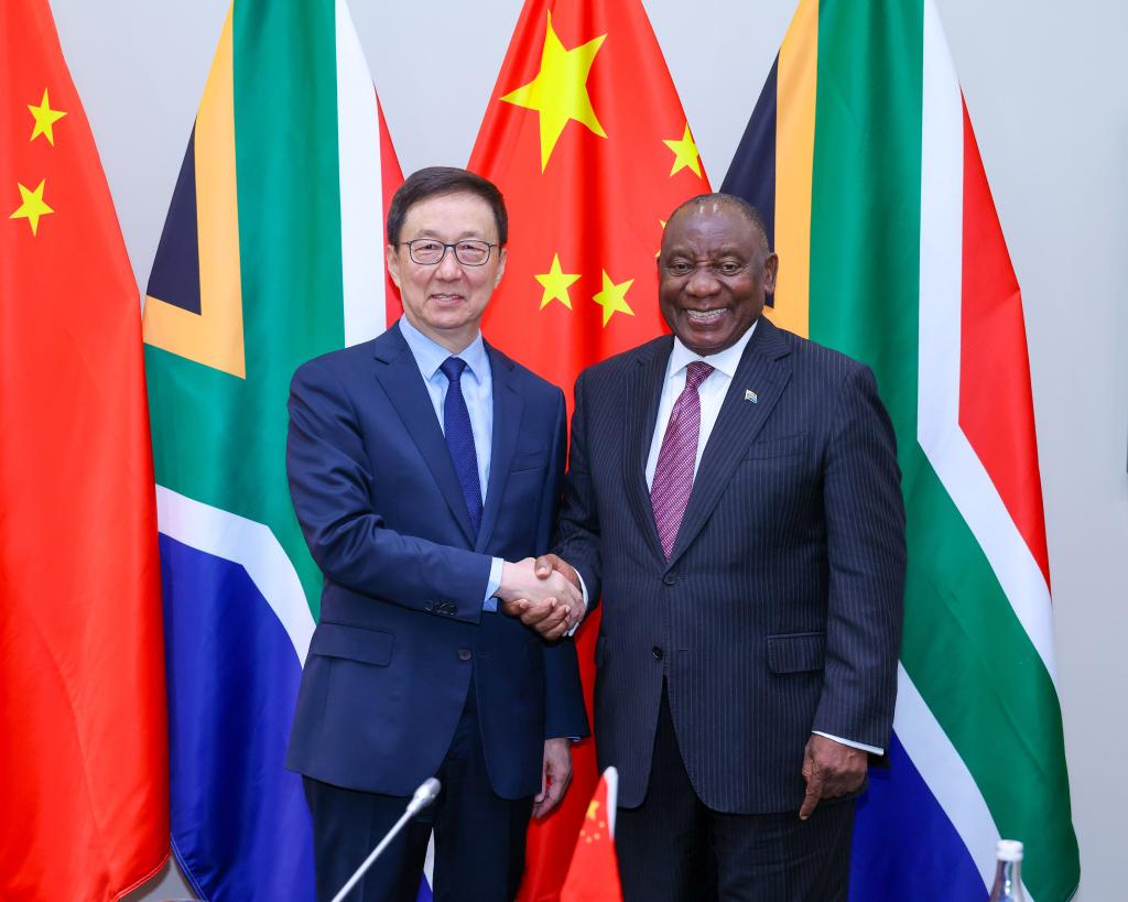 会见拉马福萨时,韩正转达习近平主席对拉马福萨总统的亲切问候和良好祝愿。韩正表示,中方高度重视中南关系发展,愿同南非方一道,推动两国元首确立的中南新时代全方位战略合作伙伴关系不断取得新的发展。中南双方要不断加强政治互信,继续在彼此关切的问题上相互支持,保持高层交往势头,增进执政党互学互鉴。习近平主席近日宣布中方将于5月1日起对53个非洲建交国全面实施零关税举措。中方愿同南非方尽早就共同发展经济伙伴关系协定早期收获安排达成一致,统筹推进务实合作。中南都是重要的发展中大国,双方要共同维护公平正义。中方愿同南非在多边机制内加强沟通协调,共同提升全球南方在国际事务中的影响力和发言权。