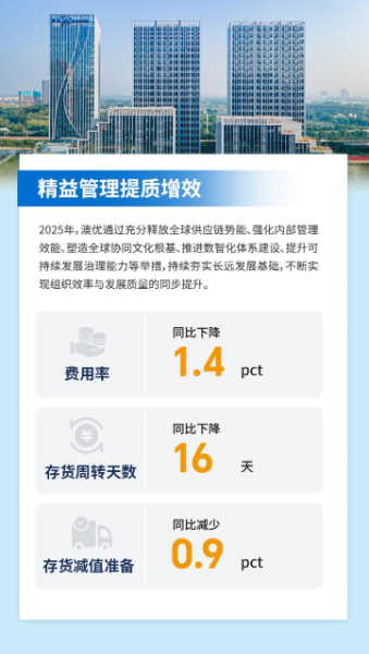 2025 年,澳优通过充分释放全球供应链势能、强化内部管理效能、塑造全球协同文化根基、推进数智化体系建设、提升可持续发展治理能力等举措,持续夯实长远发展基础,不断实现组织效率与发展质量的同步提升。