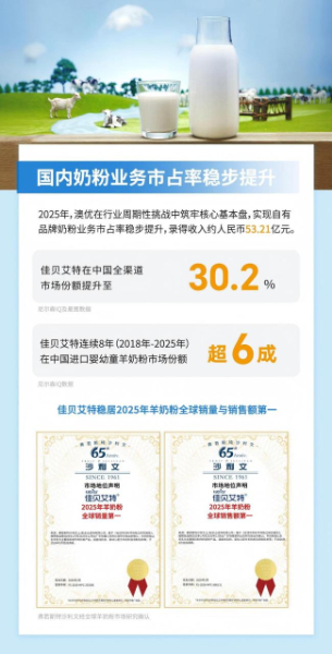 尼尔森IQ数据同时显示,公司牛奶粉业务稳住市场份额,标志着因前期内部整合与渠道调整带来的阶段性影响全面结束。截至公告发布期,澳优旗下海普诺凯斩获艾媒咨询(iiMedia Research)“2025婴幼儿全面营养奶粉全国销量第一”及“中国全面营养婴配奶粉开创者”双重认证,这也是其连续三年蝉联全面营养奶粉销量榜首。