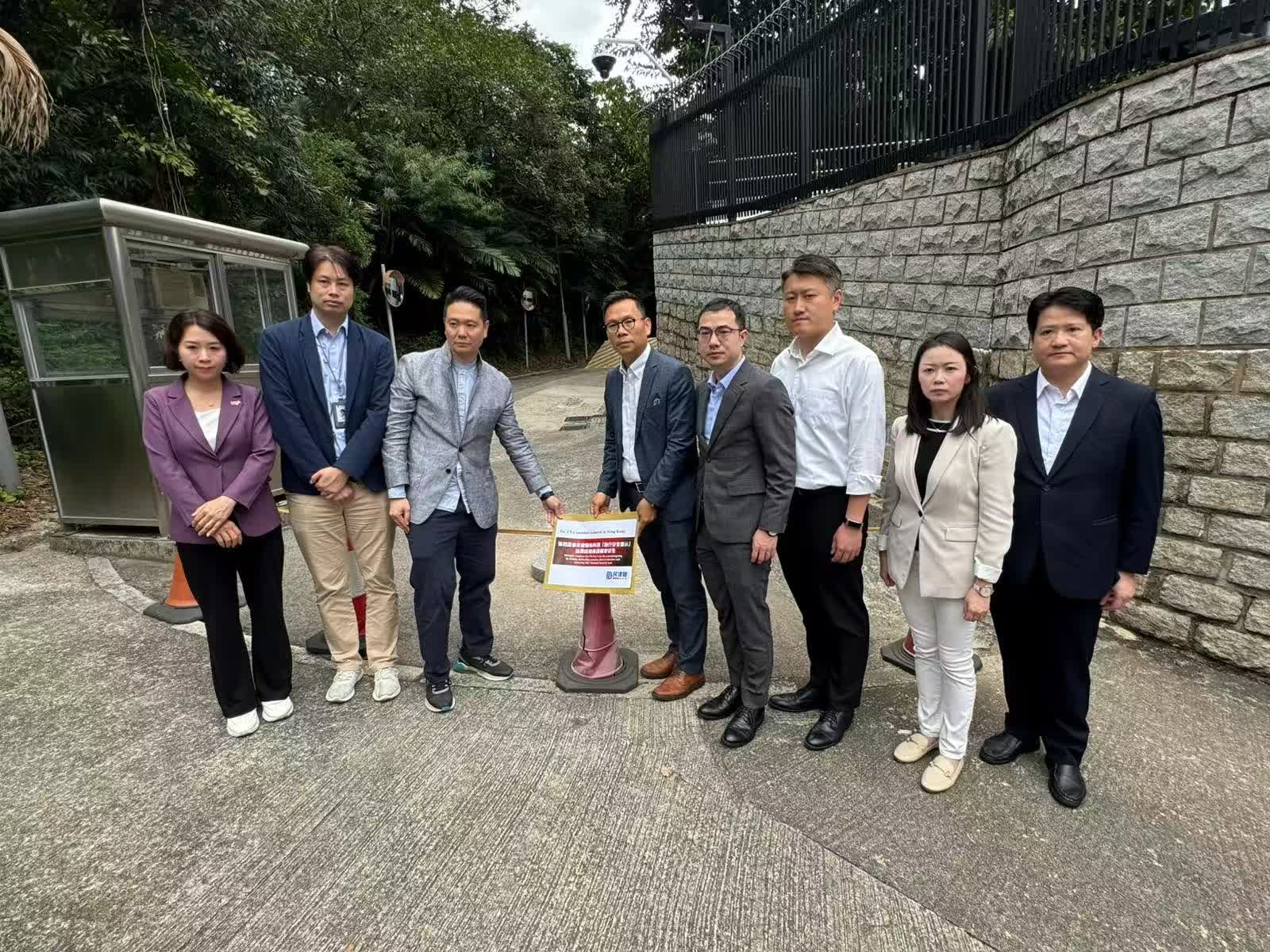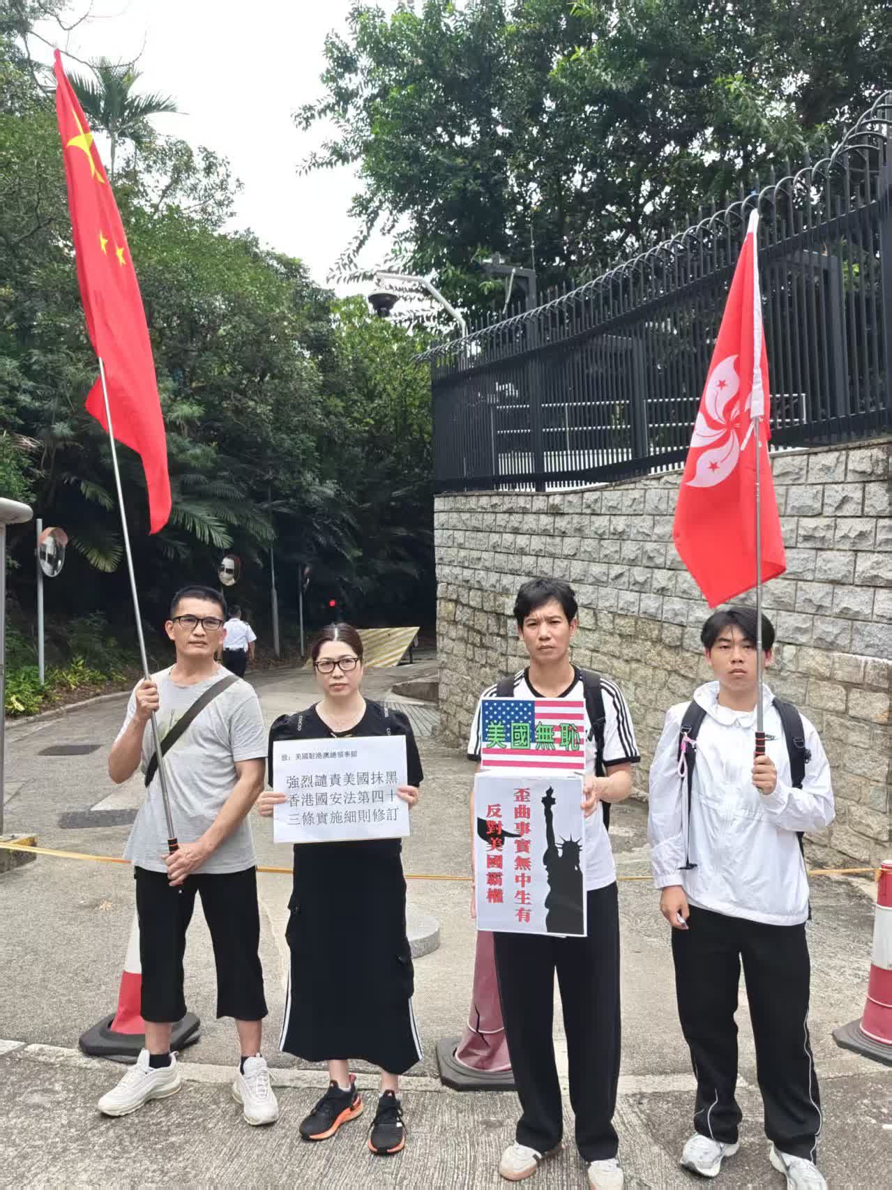 民建聯約20人於美國駐港領事館外進行抗議。現場集會人士各自手舉「馬上停止干涉中國內政」、「美方雙重標準行為卑劣」等告示,拉出帶有民建聯標識的「強烈譴責美國發布所謂『旅行安全警示』抹黑香港維護國家安全」的長橫幅,並放置抗議書於領館大門外的路障上。