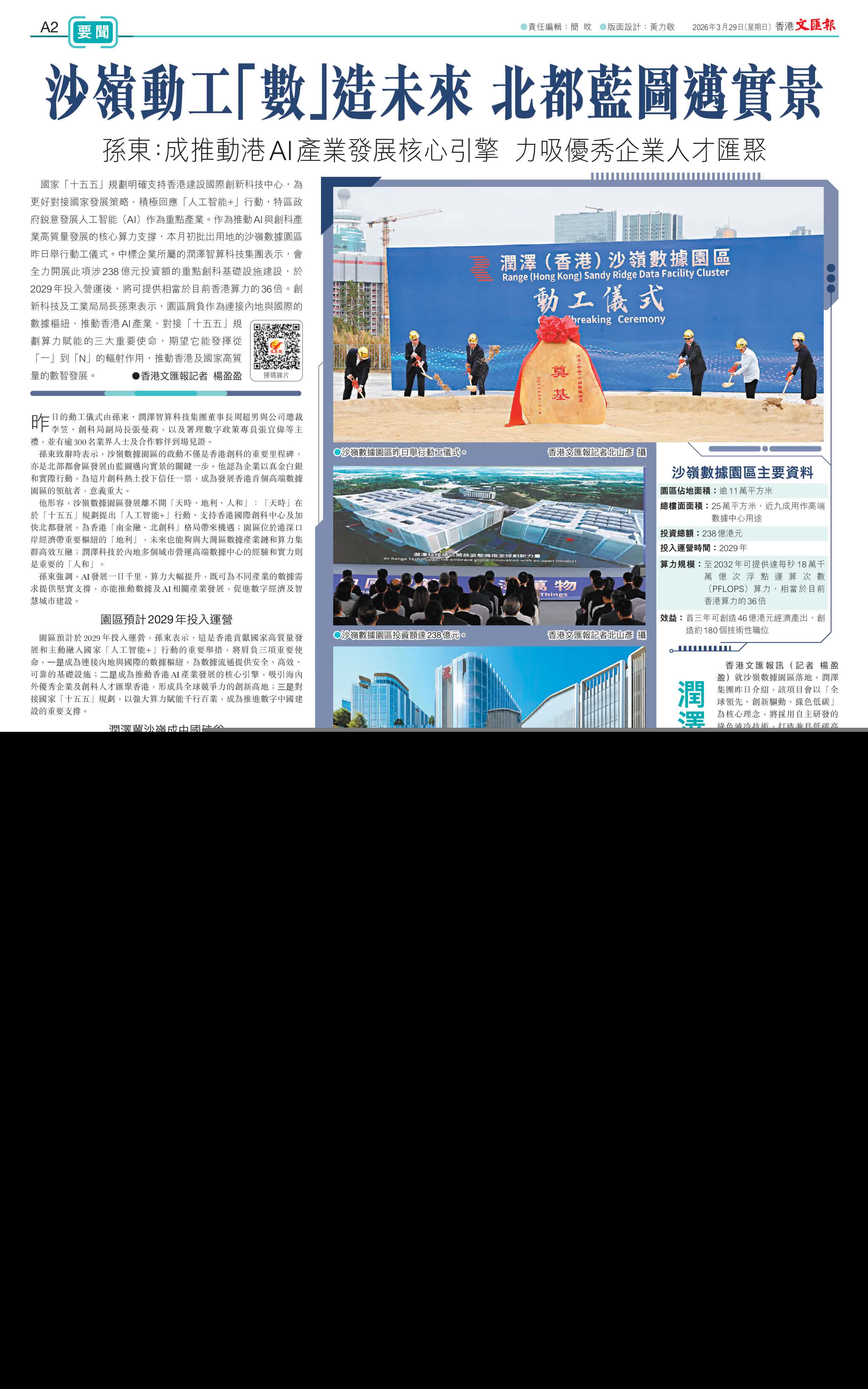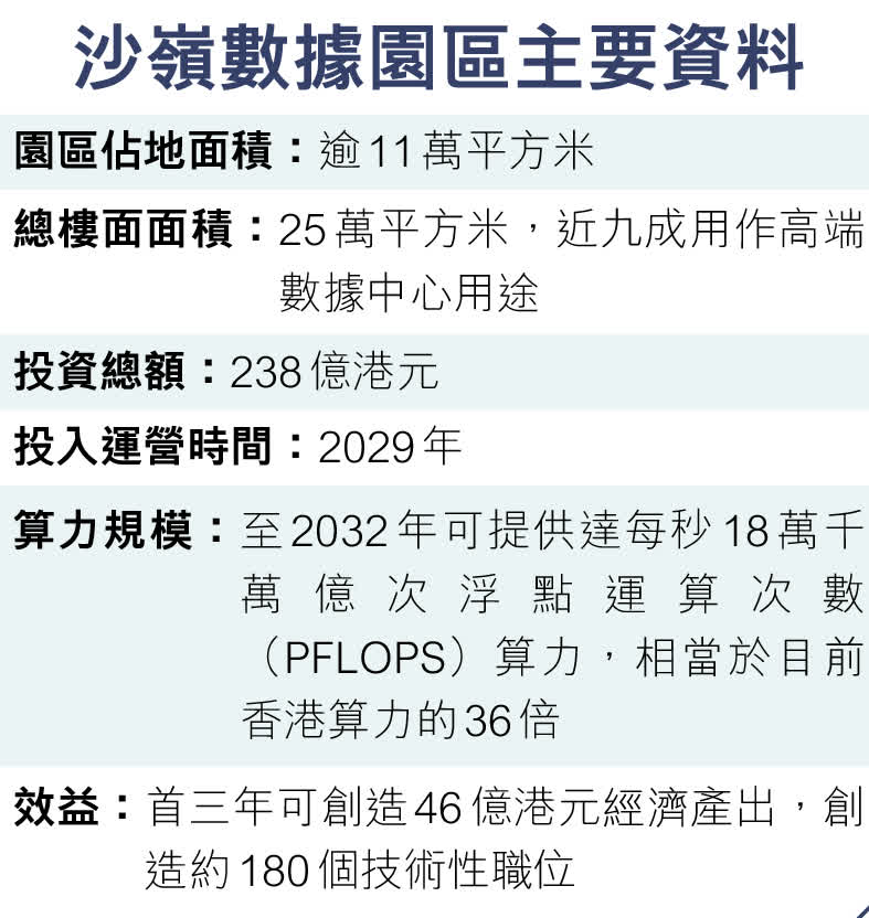 (香港文匯報記者 楊盈盈)國家「十五五」規劃明確支持香港建設國際創新科技中心,為更好對接國家發展策略,積極回應「人工智能+」行動,特區政府銳意發展人工智能(AI)作為重點產業。作為推動AI與創科產業高質量發展的核心算力支撐,本月初批出用地的沙嶺數據園區昨日舉行動工儀式。中標企業所屬的潤澤智算科技集團表示,會全力開展此項涉238億元投資額的重點創科基礎設施建設,於2029年投入營運後,將可提供相當於目前香港算力的36倍。創新科技及工業局局長孫東表示,園區肩負作為連接內地與國際的數據樞紐、推動香港AI產業、對接「十五五」規劃算力賦能的三大重要使命,期望它能發揮從「一」到「N」的輻射作用,推動香港及國家高質量的數智發展。