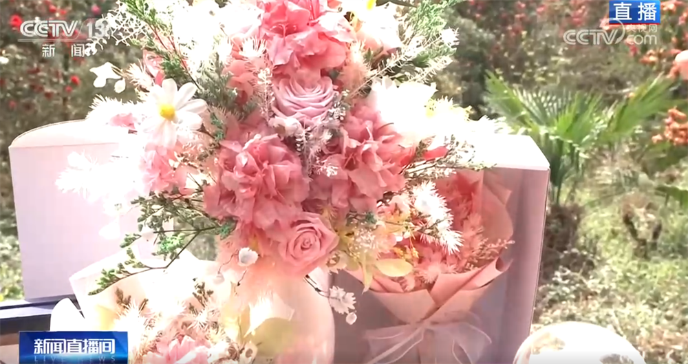 除了赏花玩游戏,我们还能将花带回家。您看这几朵杜鹃花是不是栩栩如生?这是景区最新推出的文创产品——永生花。它是用真花经过特殊处理做成的,不但颜色鲜艳,还能和玫瑰等其他花搭配。试想想,我们逛完花海,再带上一束这样的永生花送给亲朋好友,是不是挺有意义?