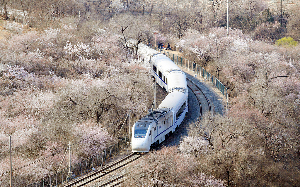 3月28日,北京,一列北京市郊铁路S2线列车穿行在居庸关长城脚下的花海中。每年3月中旬,从北京昌平区的南口站到八达岭站,桃花、杏花沿山坡绽放,吸引众多市民游客前来体验浪漫的赏花之旅。