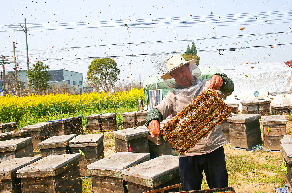 3月29日,江苏南通,蜂农在油菜花田边采收蜂蜜。
