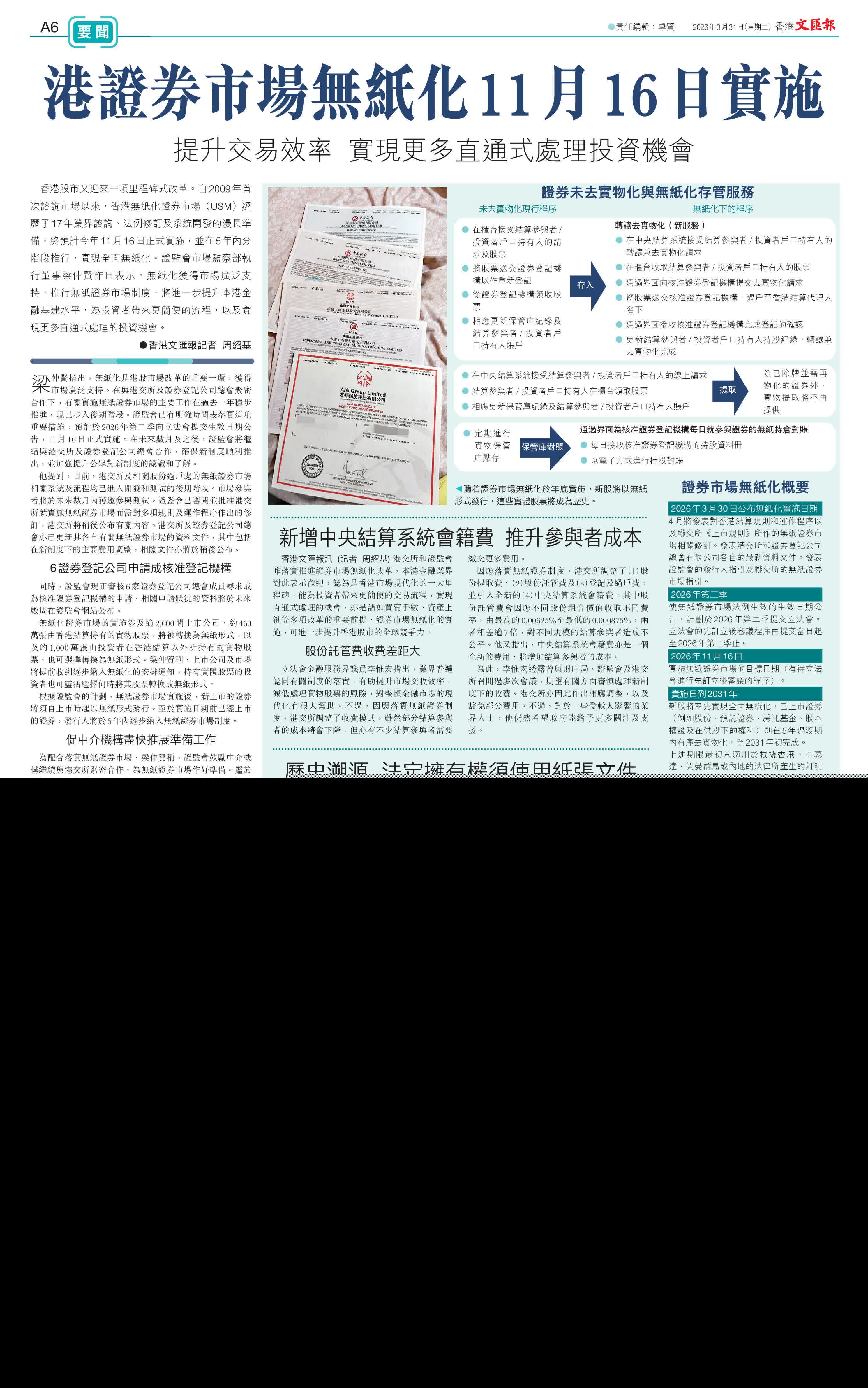 他提到,目前,港交所及相關股份過戶處的無紙證券市場相關系統及流程均已進入開發和測試的後期階段。市場參與者將於未來數月內獲邀參與測試。證監會已審閱並批准港交所就實施無紙證券市場而需對多項規則及運作程序作出的修訂,港交所將稍後公布有關內容。港交所及證券登記公司總會亦已更新其各自有關無紙證券市場的資料文件,其中包括在新制度下的主要費用調整,相關文件亦將於稍後公布。