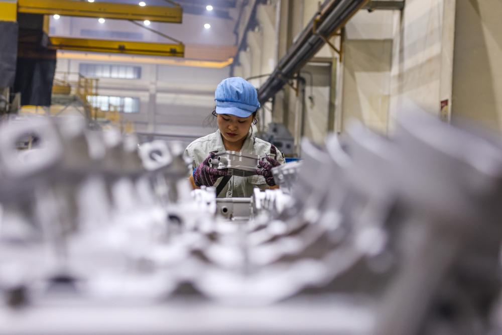 2025年10月16日,工人在浙江省宁波市江北区爱柯迪股份有限公司的生产线上工作。新华社记者 江汉 摄
