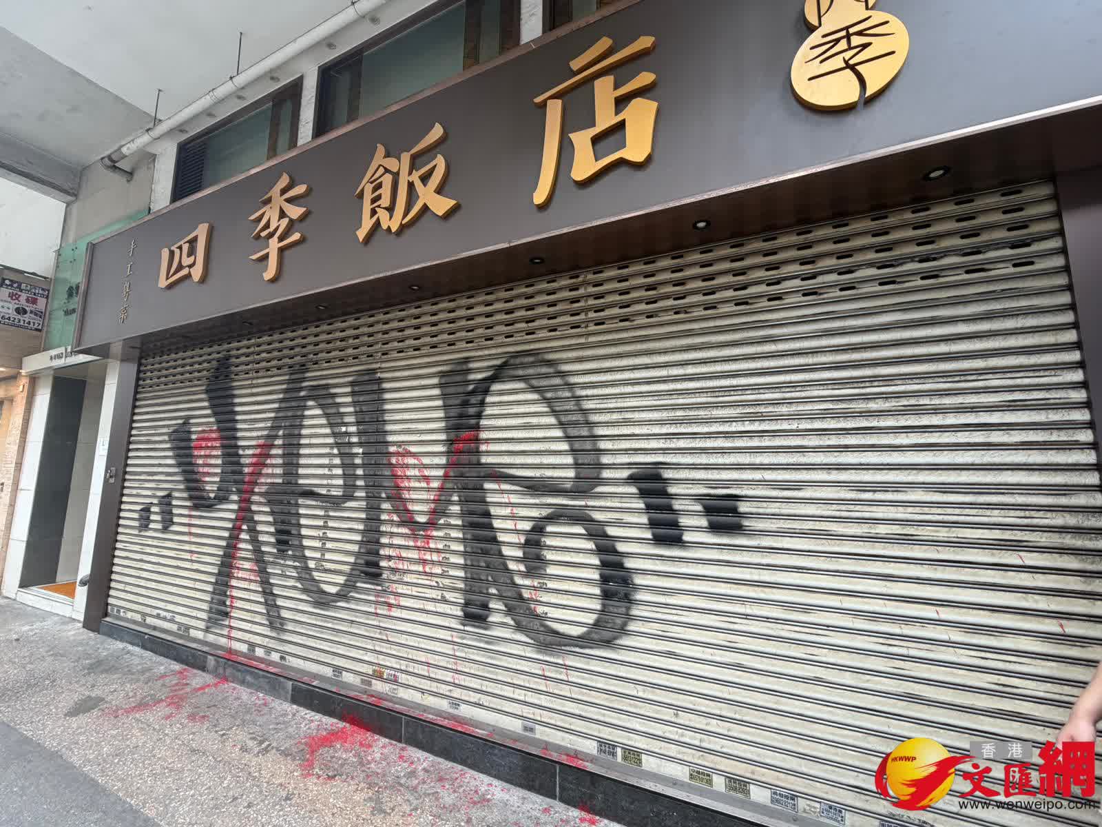 其後,警方再接獲區內駱克道405至419號地下一間小炒餐廳,以及天樂里2至4號地下的一間飯店 ,其大門及捲閘均在早前遭人潑淋紅色油漆。警方接報後,現正調查案件。