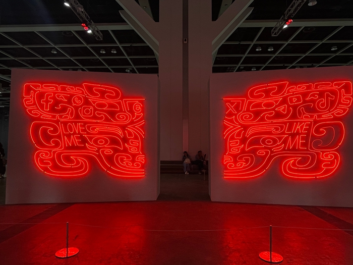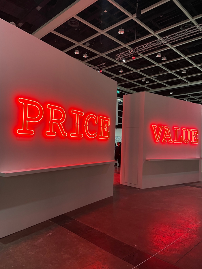 步入2026年香港巴塞尔艺术展,从3C入口处进入展厅的瞬间,观众的视线便被一面散发出红光的巨大饕餮纹饰所吞噬,而其背后则是刺目的两个单词“PRICE”与“VALUE”——马来西亚艺术家江记用霓虹灯管打造的墙面装置《价/值/饕餮》以近乎暴烈的视觉语言直接点明艺博会的运转核心:被定价的艺术品,是否匹配它本身的价值?这一追问,恰如其分地揭示出本届巴塞尔在商业逻辑与策展话语之间所展开的深层博弈。