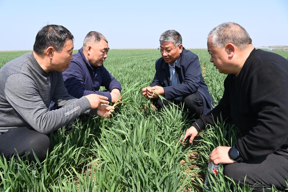农技专家正在田间查看麦田长势。(夏天 摄)