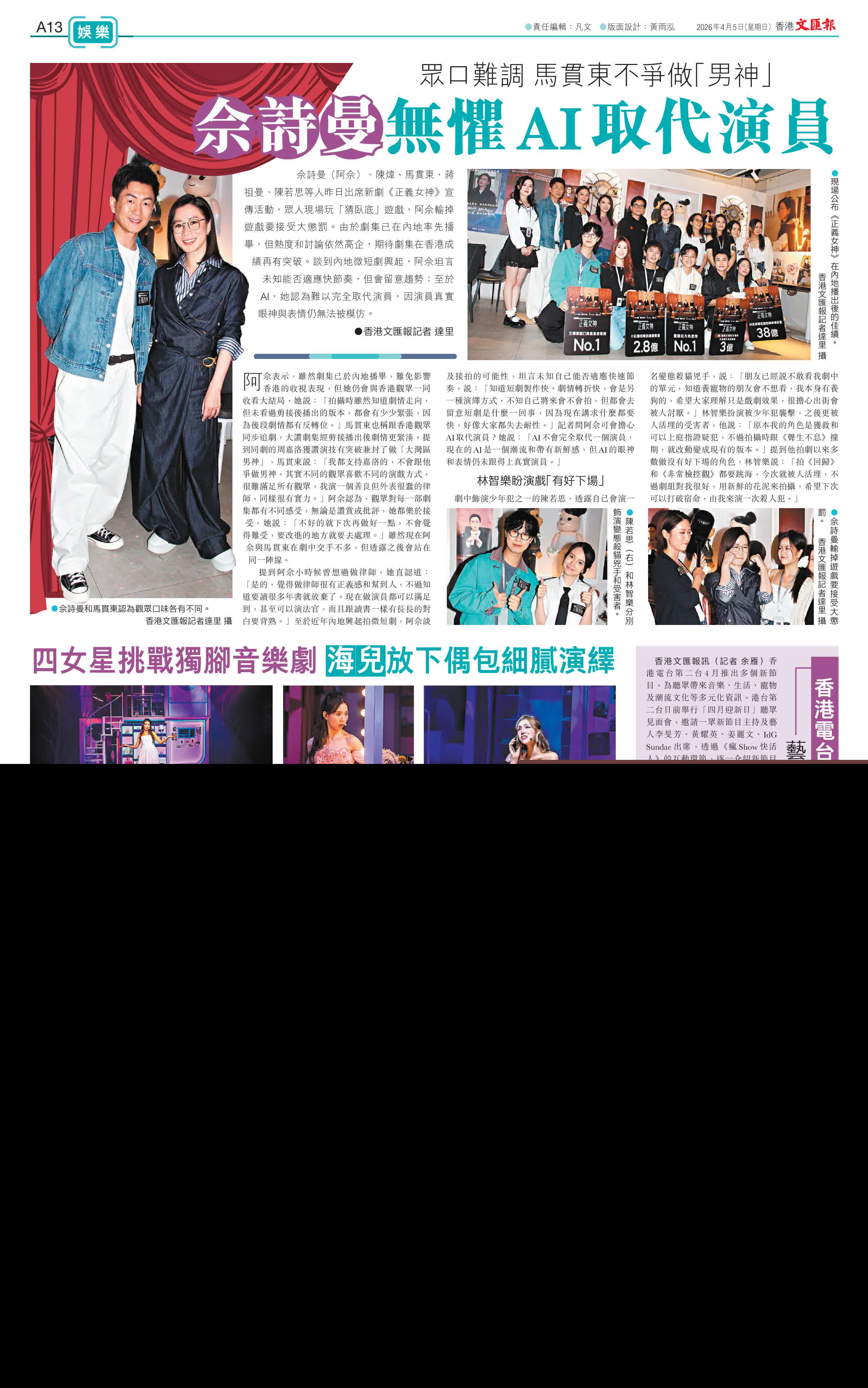 (香港文匯報記者 達里)佘詩曼(阿佘)、陳煒、馬貫東、蔣祖曼、陳若思等人昨日出席新劇《正義女神》宣傳活動,眾人現場玩「猜臥底」遊戲,阿佘輸掉遊戲要接受大懲罰。由於劇集已在內地率先播畢,但熱度和討論依然高企,期待劇集在香港成績再有突破。談到內地微短劇興起,阿佘坦言未知能否適應快節奏,但會留意趨勢;至於AI,她認為難以完全取代演員,因演員真實眼神與表情仍無法被模仿。