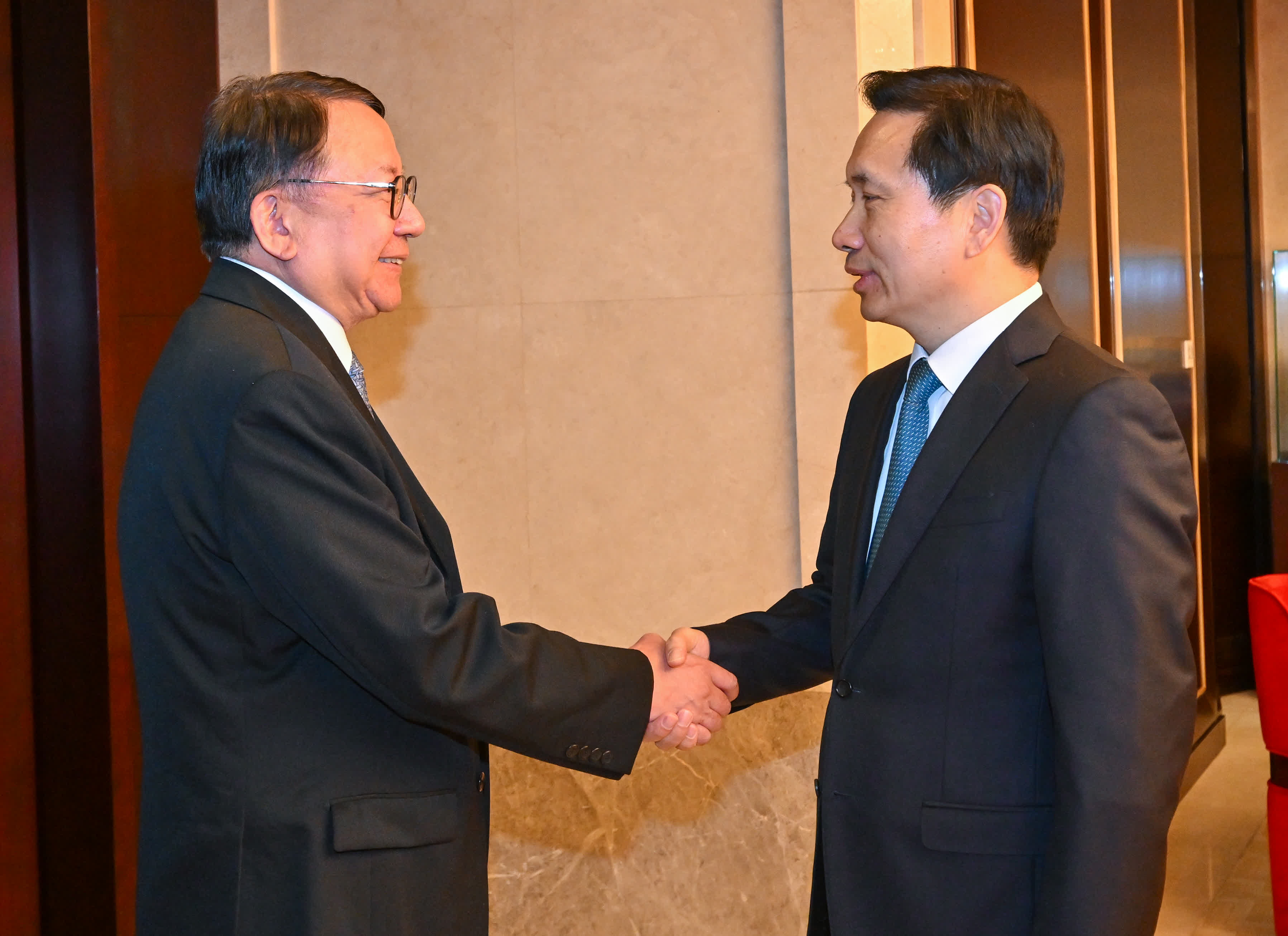 昨日,陳國基拜會陝西省委書記趙一德,就深化陝港兩地各方面的交流合作交換意見。中央港澳工作辦公室、國務院港澳事務辦公室分管日常工作的副主任徐啟方亦參加會面。陳國基指出,陝港雙方自2024年簽署《深化陝港交流合作協議》,以及一系列在法律服務、科技創新、教育、旅遊等領域的合作備忘錄起,在中央政府支持及陝港共同努力下,兩地交流合作成果豐碩,未來可在不同範疇,尤其是人文交流、教育合作、創新科技等方面加強合作,優勢互補。