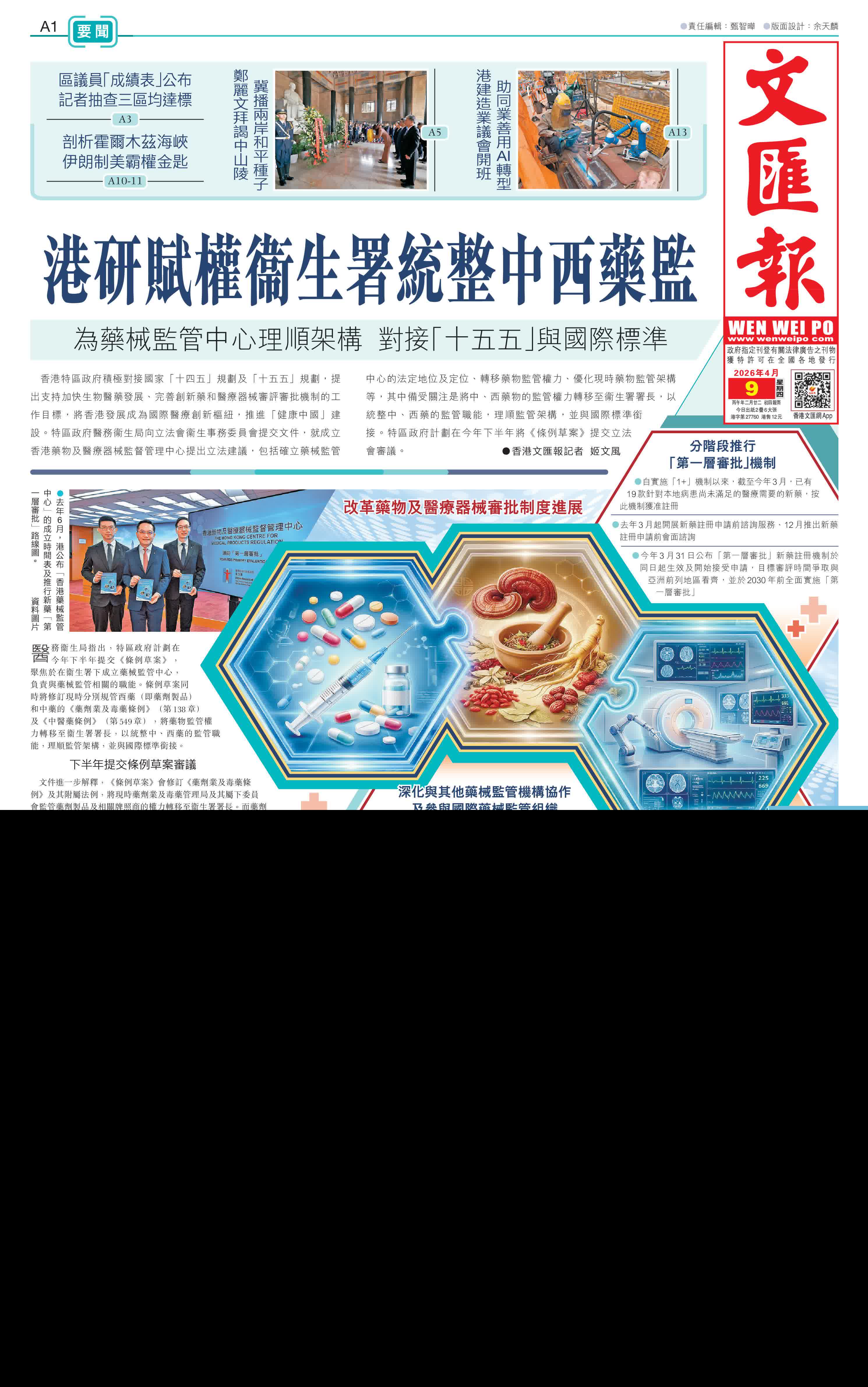 (香港文匯報記者 姬文風)香港特區政府積極對接國家「十四五」規劃及「十五五」規劃,提出支持加快生物醫藥發展、完善創新藥和醫療器械審評審批機制的工作目標,將香港發展成為國際醫療創新樞紐,推進「健康中國」建設。特區政府醫務衞生局向立法會衞生事務委員會提交文件,就成立香港藥物及醫療器械監督管理中心提出立法建議,包括確立藥械監管中心的法定地位及定位、轉移藥物監管權力、優化現時藥物監管架構等,其中備受關注是將中、西藥物的監管權力轉移至衞生署署長,以統整中、西藥的監管職能,理順監管架構,並與國際標準銜接。特區政府計劃在今年下半年將《條例草案》提交立法會審議。