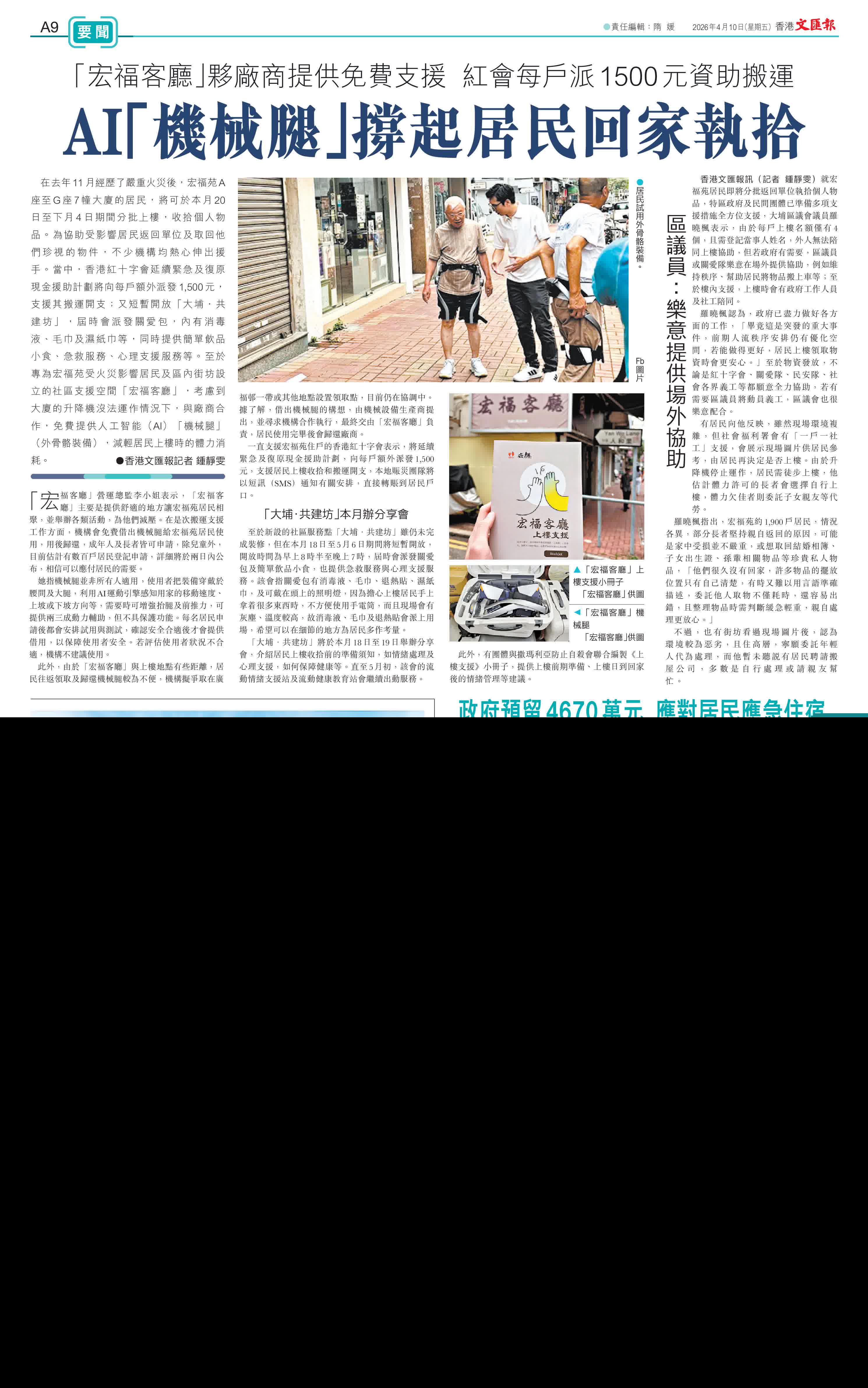 (香港文匯報記者 鍾靜雯)在去年11月經歷了嚴重火災後,宏福苑A座至G座7幢大廈的居民,將可於本月20日至下月4日期間分批上樓,收拾個人物品。為協助受影響居民返回單位及取回他們珍視的物件,不少機構均熱心伸出援手。當中,香港紅十字會延續緊急及復原現金援助計劃將向每戶額外派發1,500元,支援其搬運開支;又短暫開放「大埔·共建坊」,屆時會派發關愛包,內有消毒液、毛巾及濕紙巾等,同時提供簡單飲品小食、急救服務、心理支援服務等。至於專為宏福苑受火災影響居民及區內街坊設立的社區支援空間「宏福客廳」,考慮到大廈的升降機沒法運作情況下,與廠商合作,免費提供人工智能(AI)「機械腿」(外骨骼裝備),減輕居民上樓時的體力消耗。