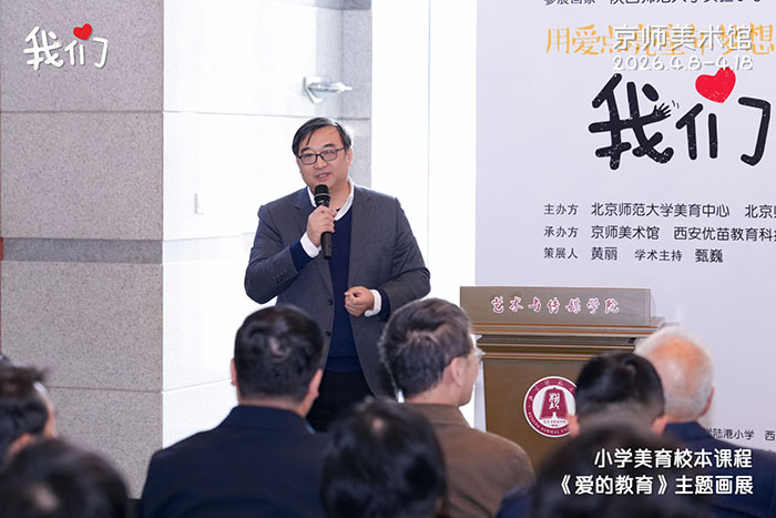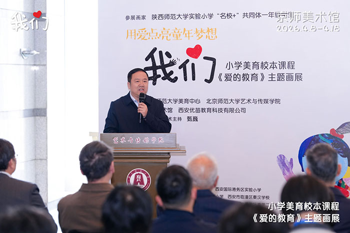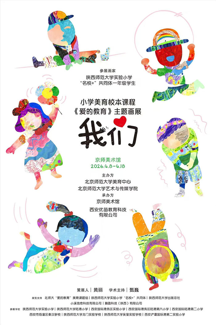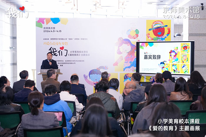 2026年4月8日下午,由北京师范大学美育中心、北京师范大学艺术与传媒学院主办的“我们——小学美育校本课程《爱的教育》主题画展”在北京师范大学京师美术馆开幕。本次展览是基础教育阶段小学美育校本课程的重要实践成果,集中展出陕西师范大学实验小学“名校+”共同体一年级学生创作的600余幅优秀作品。孩子们以童真笔触诠释对 “爱” 与 “成长” 的理解,用色彩与创意点亮童年梦想,生动展现了高校与基础教育协同育人、“名校+”共同体美育均衡发展的探索成果。