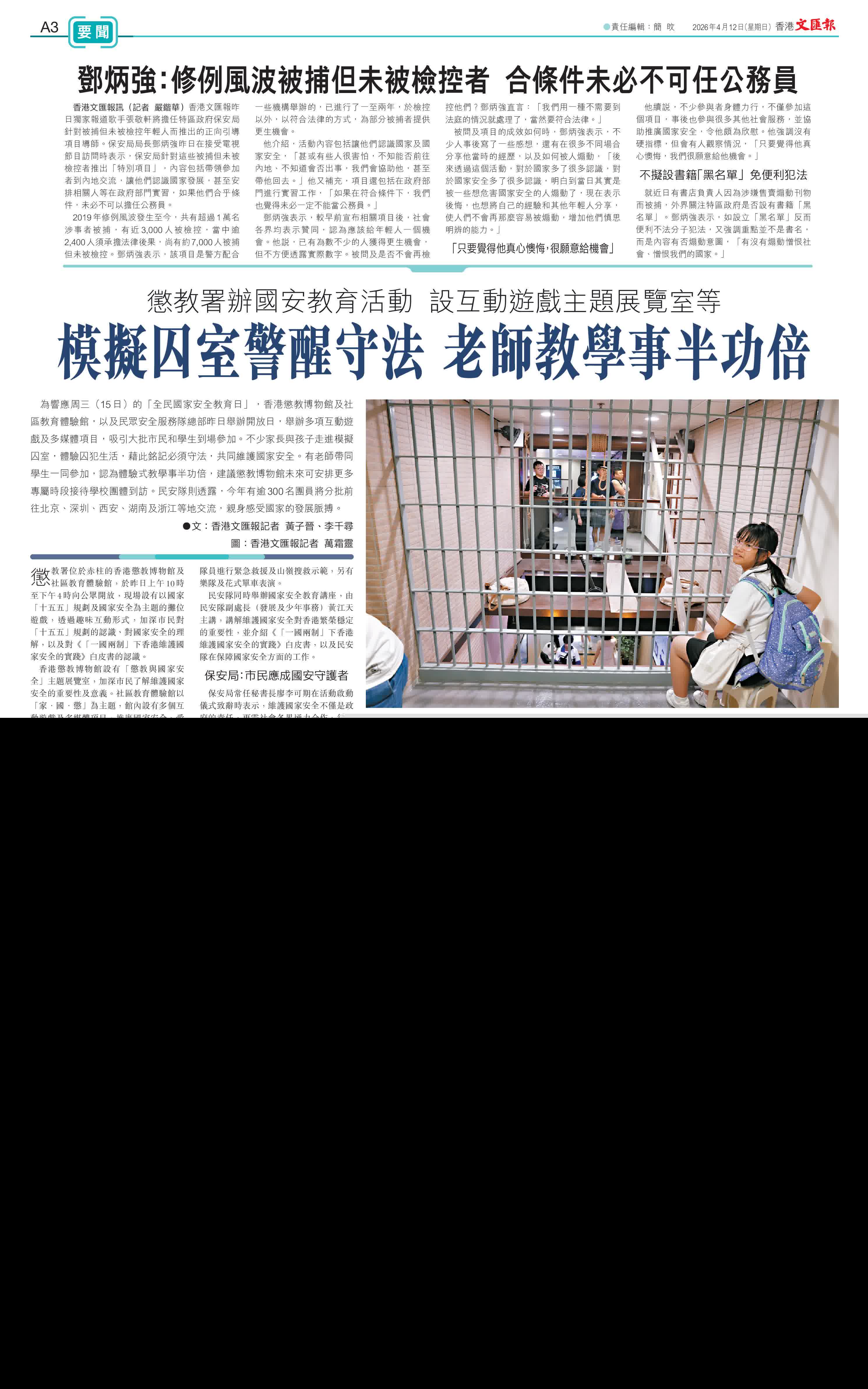(香港文匯報記者 黃子晉、李千尋)為響應周三(15日)的「全民國家安全教育日」,香港懲教博物館及社區教育體驗館,以及民眾安全服務隊總部昨日舉辦開放日,舉辦多項互動遊戲及多媒體項目,吸引大批市民和學生到場參加。不少家長與孩子走進模擬囚室,體驗囚犯生活,藉此銘記必須守法,共同維護國家安全。有老師帶同學生一同參加,認為體驗式教學事半功倍,建議懲教博物館未來可安排更多專屬時段接待學校團體到訪。民安隊則透露,今年有逾300名團員將分批前往北京、深圳、西安、湖南及浙江等地交流,親身感受國家的發展脈搏。
