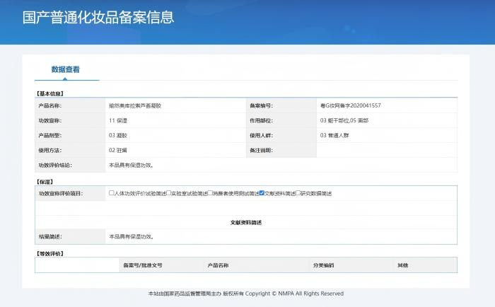 例如,一款在某电商平台销量万件以上的“瑜然美库拉索芦荟凝胶”,在商品页面上宣称可以“舒缓红敏”“晒伤修复”“祛痘消印”。但记者查询国家药监局官网发现,其备案功效仅为“保湿”。“冰肤之萃补水芦荟胶”同样只备案了保湿功效,却在多个电商平台上被宣传为具有“晒后修复”“祛痘消印”等功效。