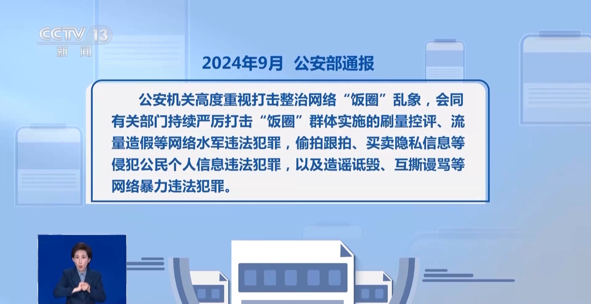 2024年9月,公安部通报,公安机关高度重视打击整治网络“饭圈”乱象,会同有关部门持续严厉打击“饭圈”群体实施的刷量控评、流量造假等网络水军违法犯罪,偷拍跟拍、买卖隐私信息等侵犯公民个人信息违法犯罪,以及造谣诋毁、互撕谩骂等网络暴力违法犯罪。