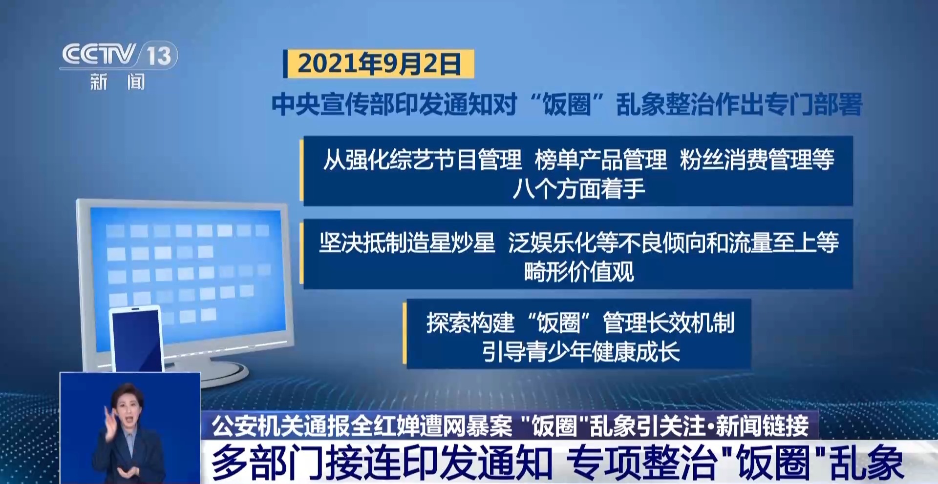 2021年9月2日,中央宣传部印发通知对“饭圈”乱象整治作出专门部署。从强化综艺节目管理、榜单产品管理、粉丝消费管理等八个方面着手,坚决抵制造星炒星、泛娱乐化等不良倾向和流量至上等畸形价值观,探索构建“饭圈”管理长效机制,引导青少年健康成长。