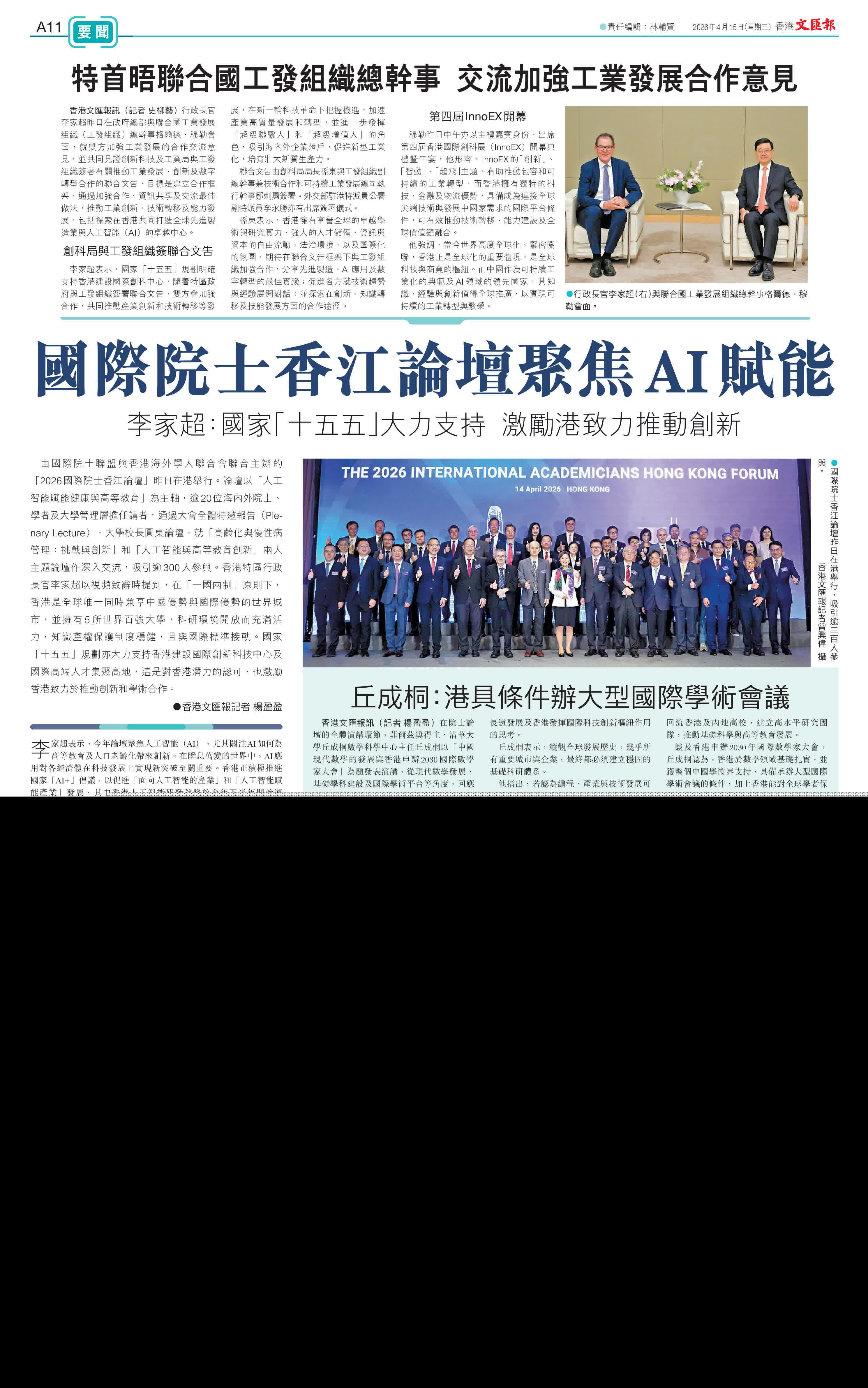 (香港文匯報記者 楊盈盈)由國際院士聯盟與香港海外學人聯合會聯合主辦的「2026國際院士香江論壇」昨日在港舉行。論壇以「人工智能賦能健康與高等教育」為主軸,逾20位海內外院士、學者及大學管理層擔任講者,通過大會全體特邀報告(Plenary Lecture)、大學校長圓桌論壇,就「高齡化與慢性病管理:挑戰與創新」和「人工智能與高等教育創新」兩大主題論壇作深入交流,吸引逾300人參與。香港特區行政長官李家超以視頻致辭時提到,在「一國兩制」原則下,香港是全球唯一同時兼享中國優勢與國際優勢的世界城市,並擁有5所世界百強大學,科研環境開放而充滿活力,知識產權保護制度穩健,且與國際標準接軌。國家「十五五」規劃亦大力支持香港建設國際創新科技中心及國際高端人才集聚高地,這是對香港潛力的認可,也激勵香港致力於推動創新和學術合作。