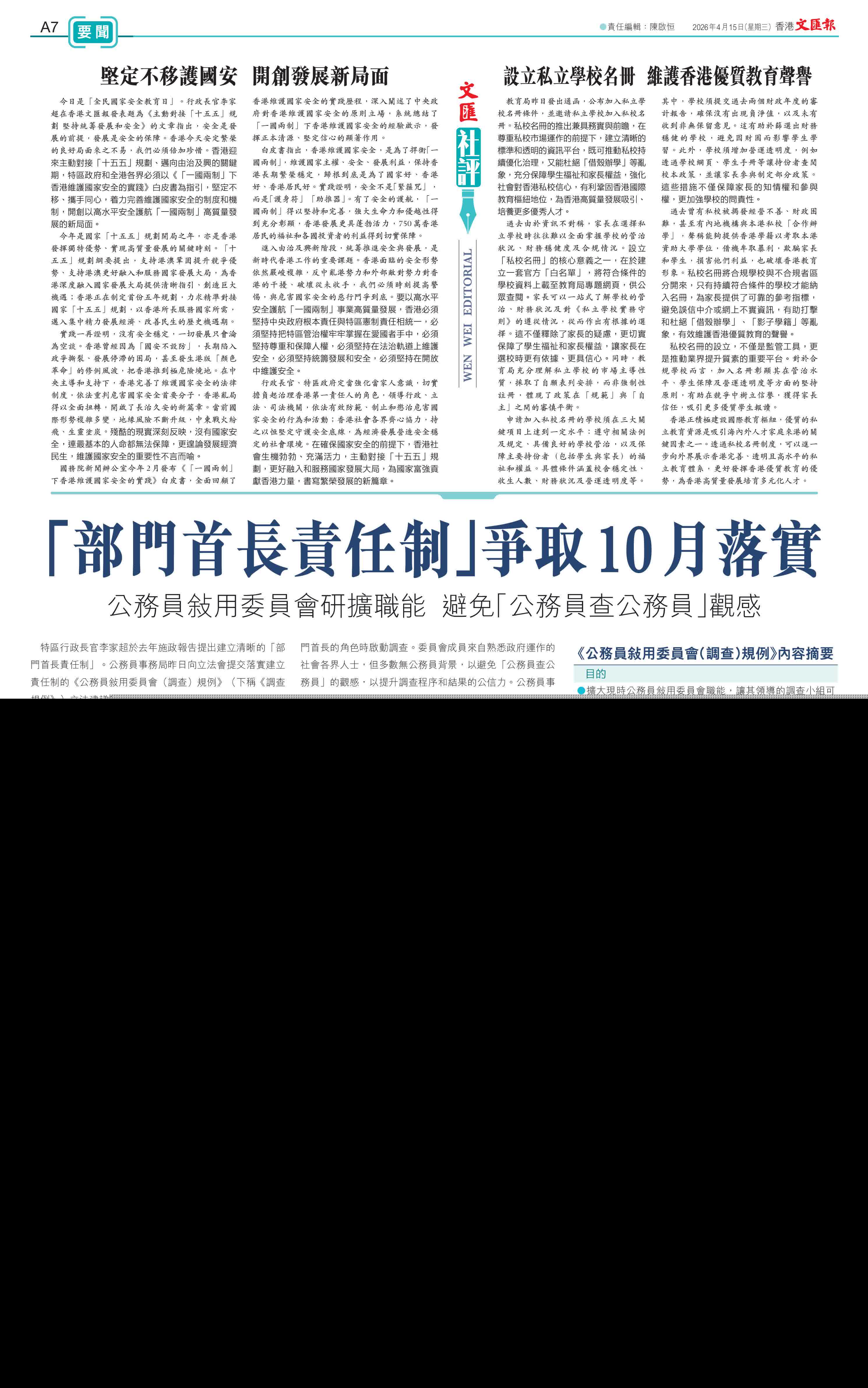 (香港文匯報記者 黃子晉)特區行政長官李家超於去年施政報告提出建立清晰的「部門首長責任制」。公務員事務局昨日向立法會提交落實建立責任制的《公務員敍用委員會(調查)規例》(下稱《調查規例》)立法建議討論文件,擬建議擴大現時公務員敍用委員會職能,讓其領導的調查小組可針對部門出現嚴重,或涉及廣泛或重複性的系統問題,或有跡象顯示問題可能涉及部門首長的角色時啟動調查。委員會成員來自熟悉政府運作的社會各界人士,但多數無公務員背景,以避免「公務員查公務員」的觀感,以提升調查程序和結果的公信力。公務員事務局發言人昨日表示,政府目標在6月將《調查規例》提交立法會「先訂立、後審議」,預期於10月中旬或之前生效。