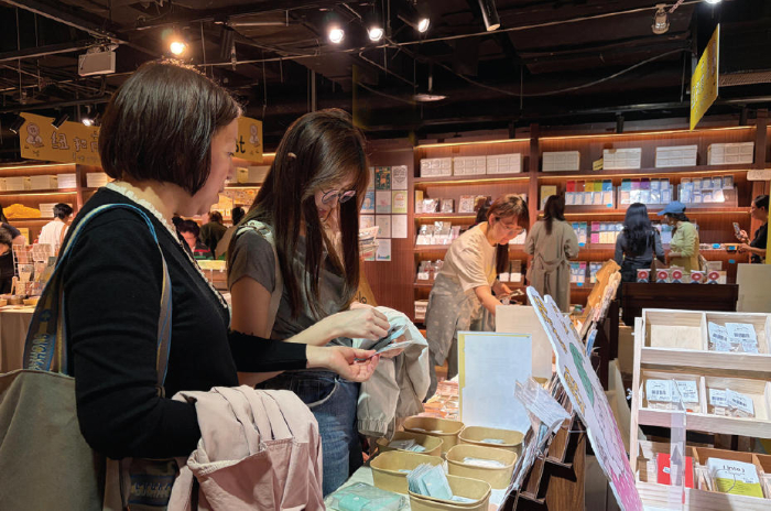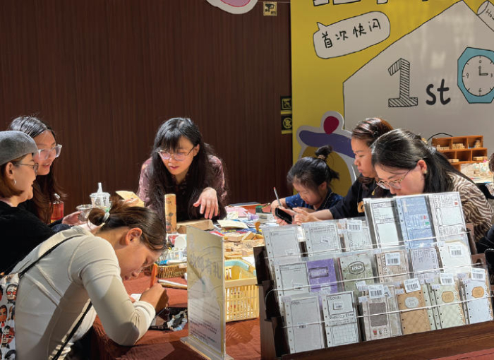 图为消费者在手账快闪店体验制作拼贴手账,并互相交流拼贴方法和构图思路。