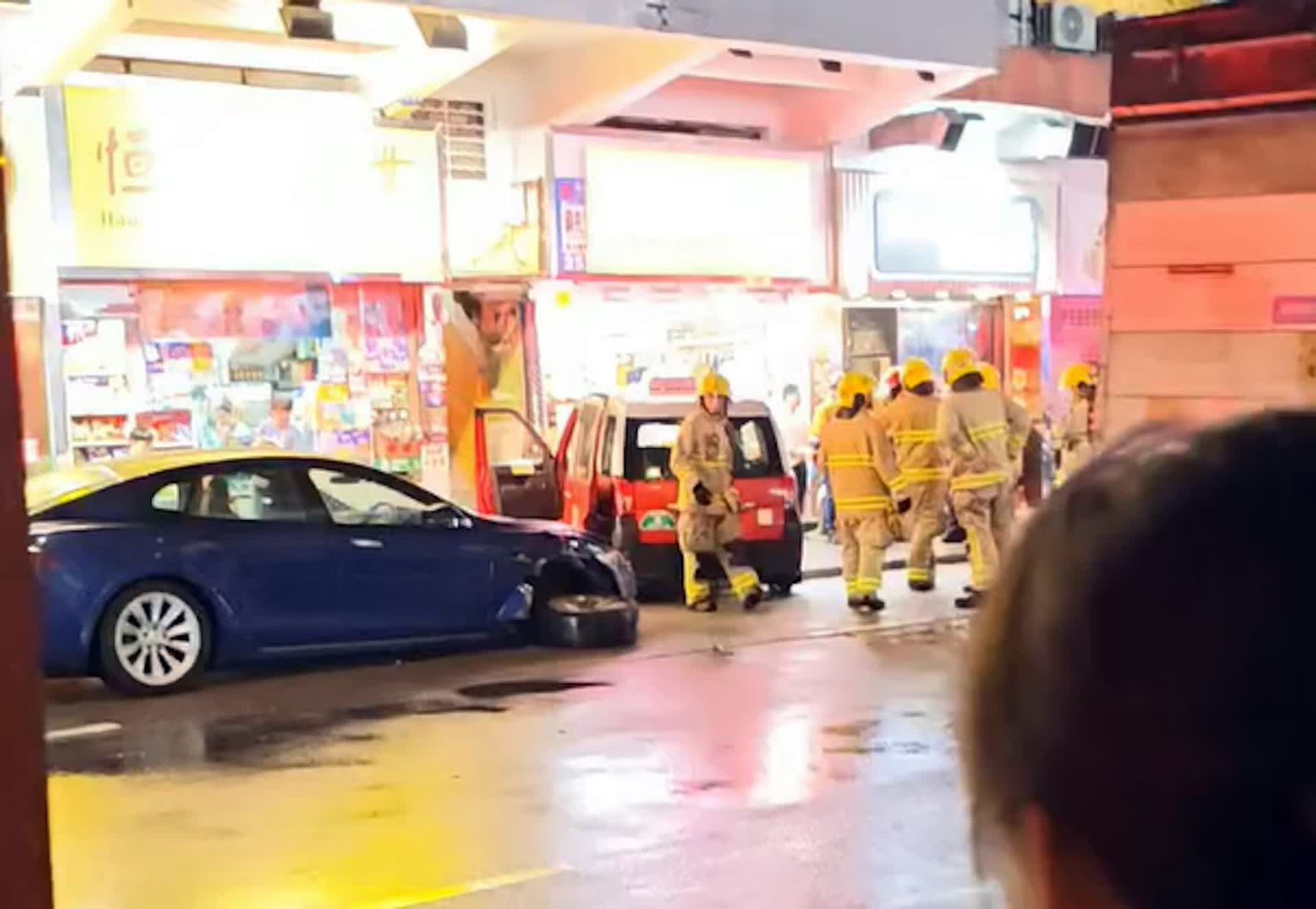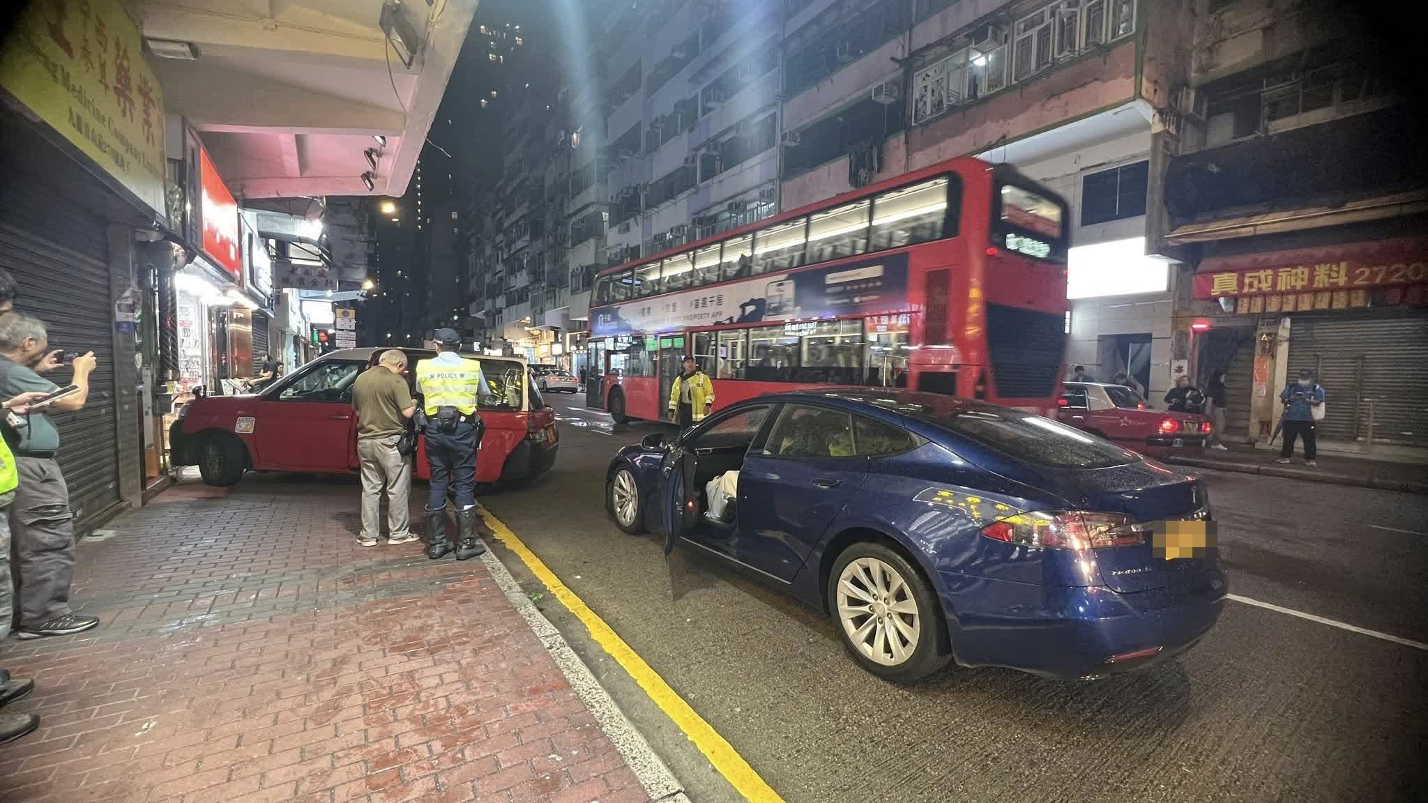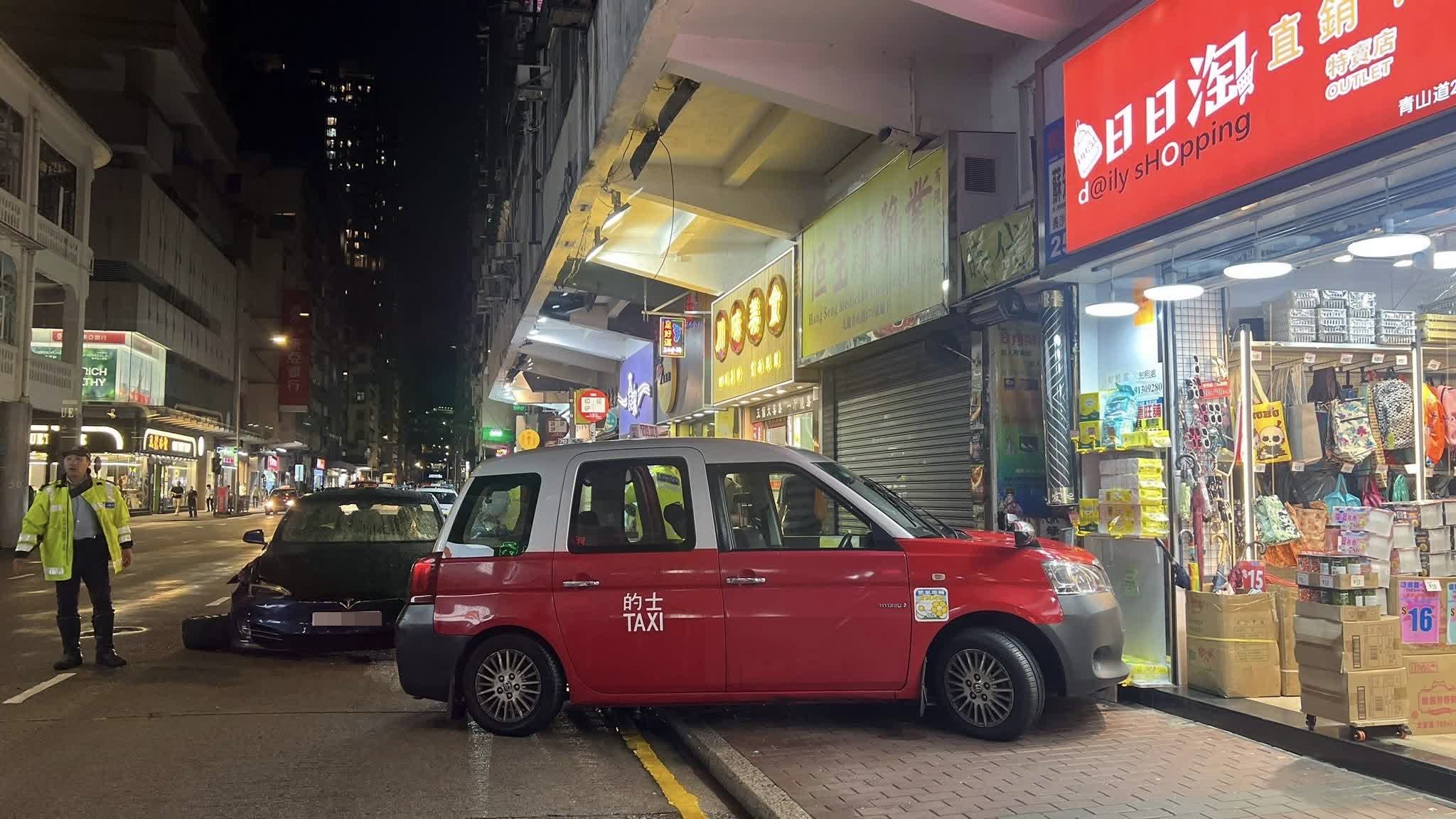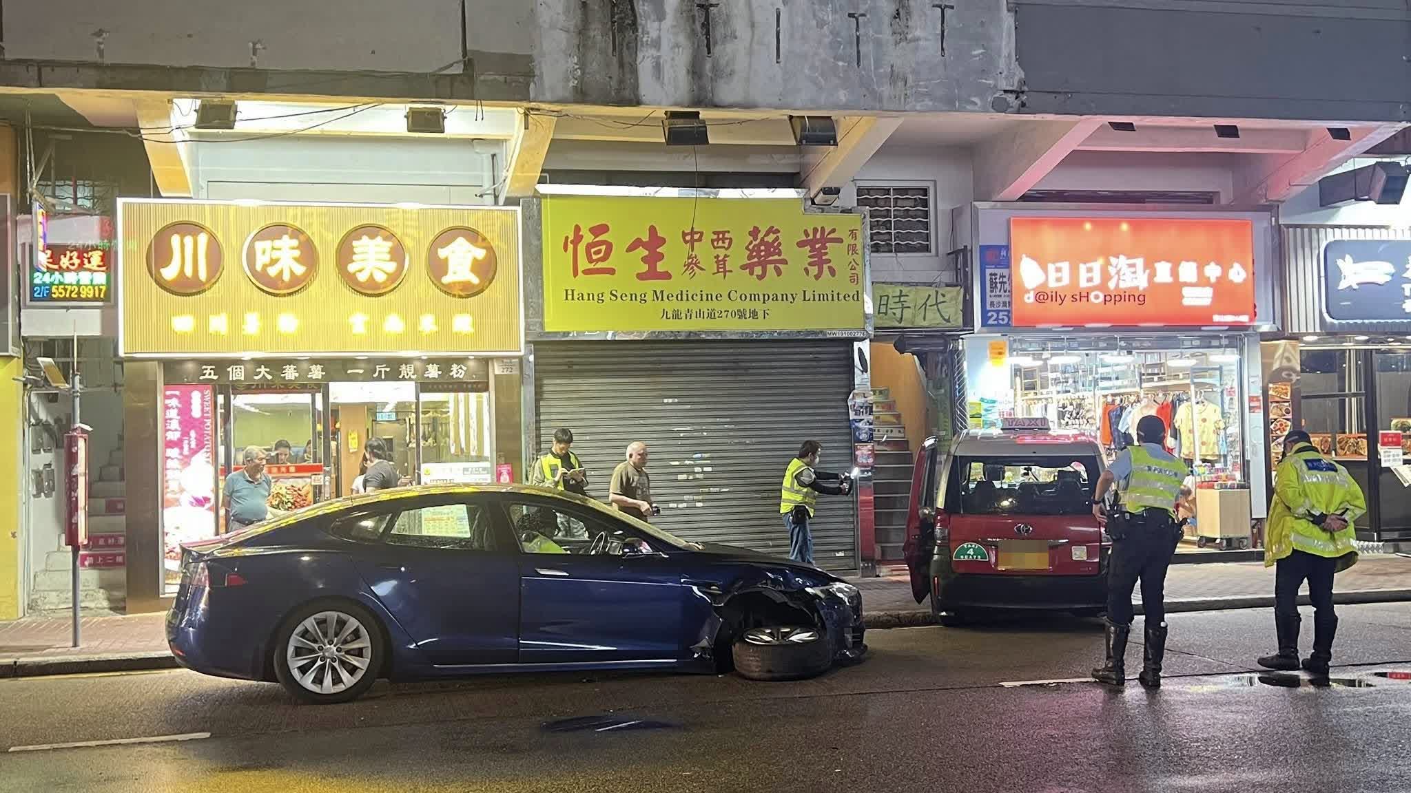 香港文匯報訊(記者 蕭景源)今日(17日)晚上近7時半,一輛的士沿長沙灣青山道往石硤尾方向駛途至270號對開,突與一輛Tesla電動私家車相撞後,再失控剷上行人路,險些衝入一間家品店。意外中,Tesla司機報稱手痛,要由救護車送往明愛醫院治理。