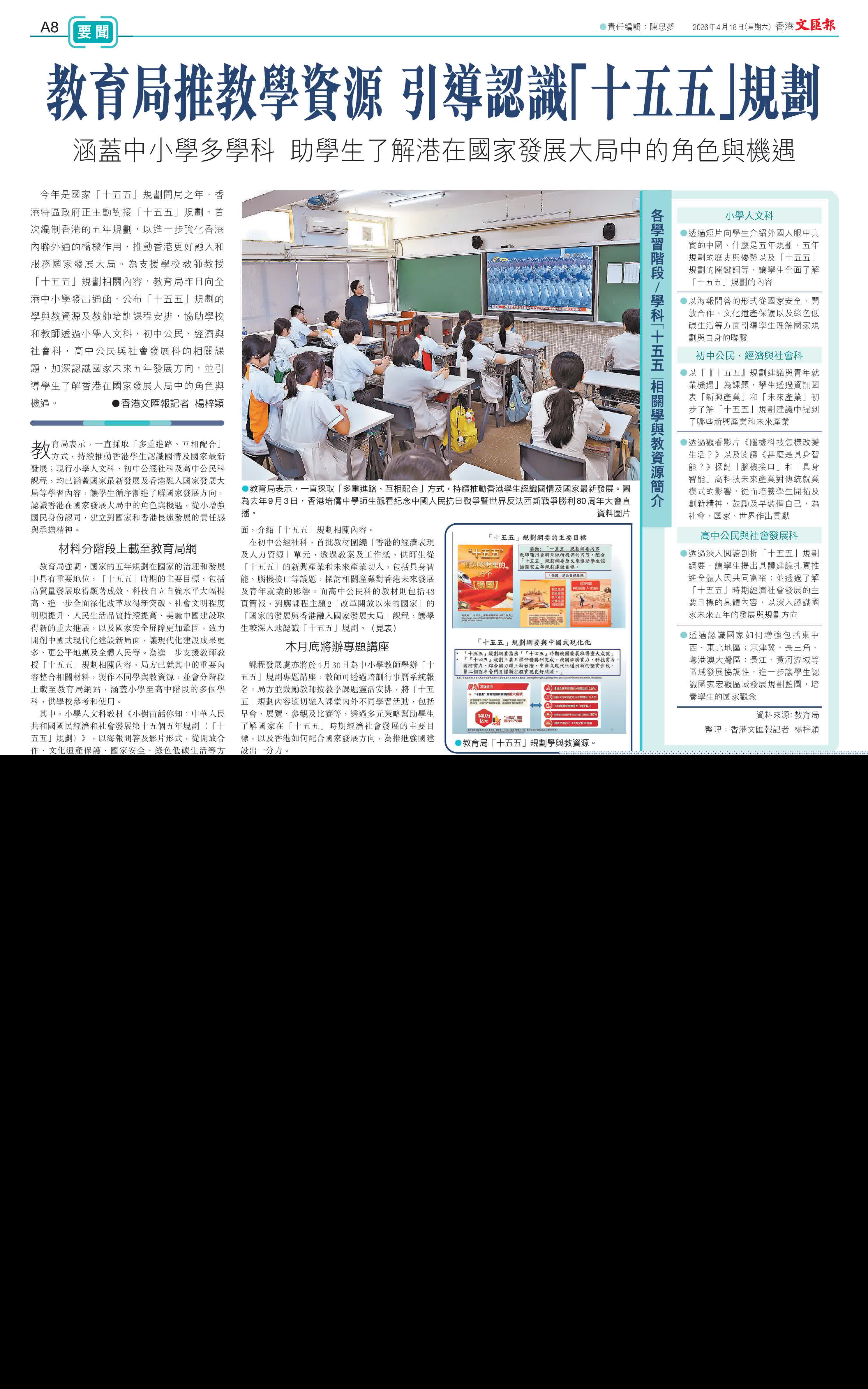 香港文匯報訊(記者 楊梓穎)今年是國家「十五五」規劃開局之年,香港特區政府正主動對接「十五五」規劃,首次編制香港的五年規劃,以進一步強化香港內聯外通的橋樑作用,推動香港更好融入和服務國家發展大局。為支援學校教師教授「十五五」規劃相關內容,教育局昨日向全港中小學發出通函,公布「十五五」規劃的學與教資源及教師培訓課程安排,協助學校和教師透過小學人文科,初中公民、經濟與社會科,高中公民與社會發展科的相關課題,加深認識國家未來五年發展方向,並引導學生了解香港在國家發展大局中的角色與機遇。