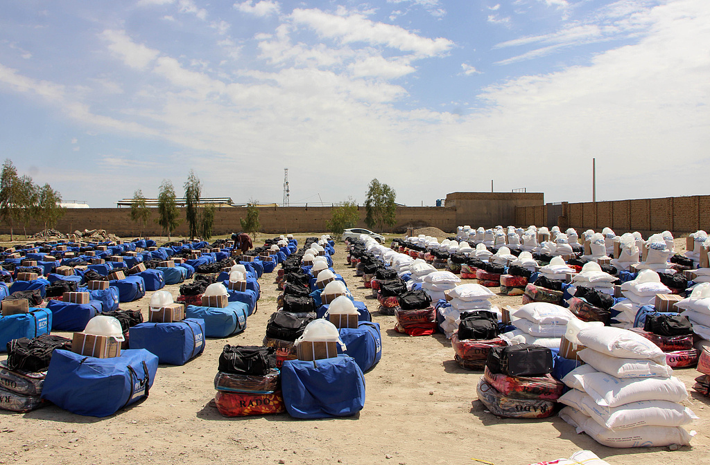 △当地时间4月13日,阿富汗坎大哈省的洪水受灾民众领取救援物资。