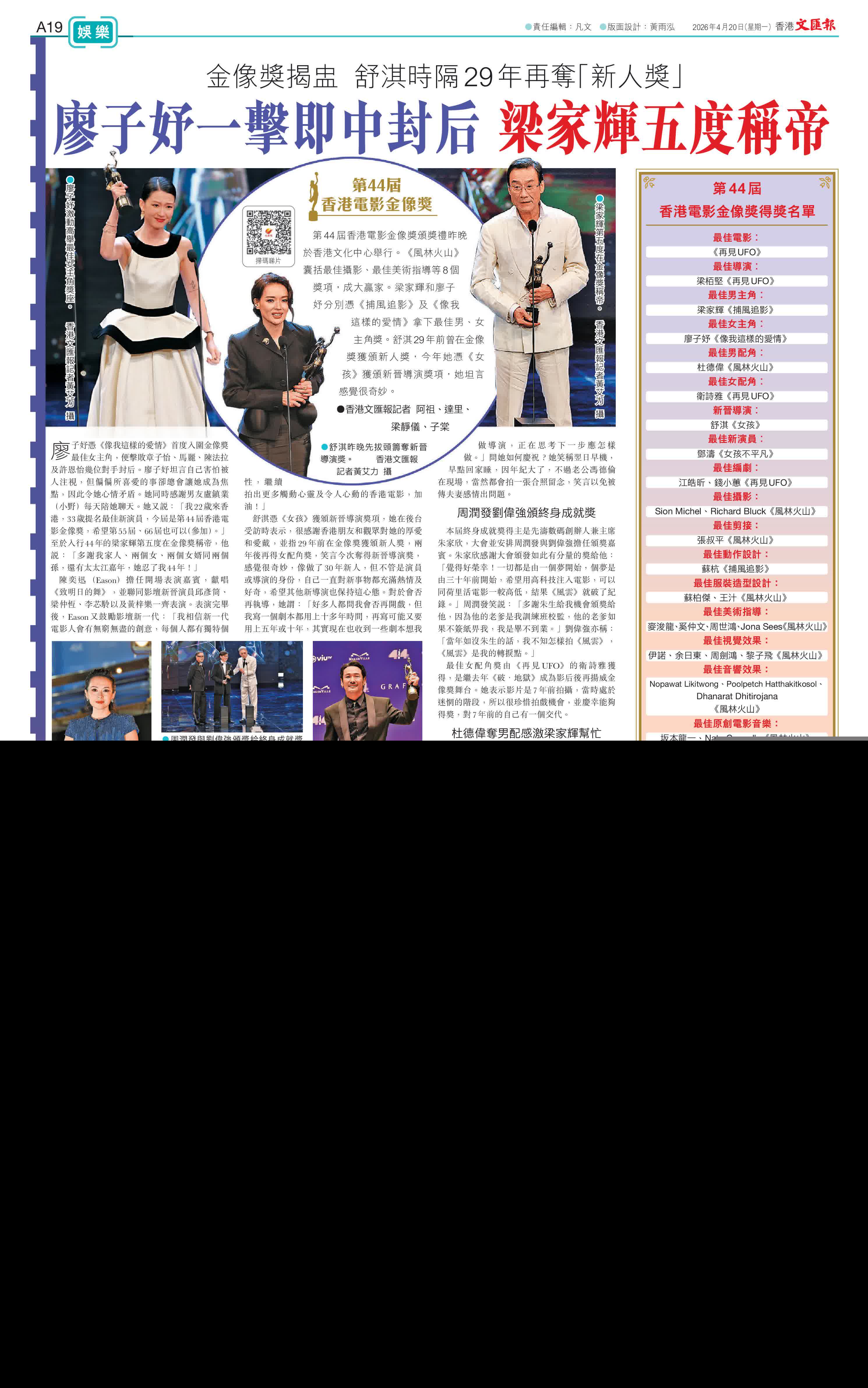 (香港文匯報記者 阿祖、達里、梁靜儀、子棠)第44屆香港電影金像獎頒獎禮昨晚於香港文化中心舉行。《風林火山》囊括最佳攝影、最佳美術指導等8個獎項,成大贏家。梁家輝和廖子妤分別憑《捕風追影》及《像我這樣的愛情》拿下最佳男、女主角獎。舒淇29年前曾在金像獎獲頒新人獎,今年她憑《女孩》獲頒新晉導演獎項,她坦言感覺很奇妙。