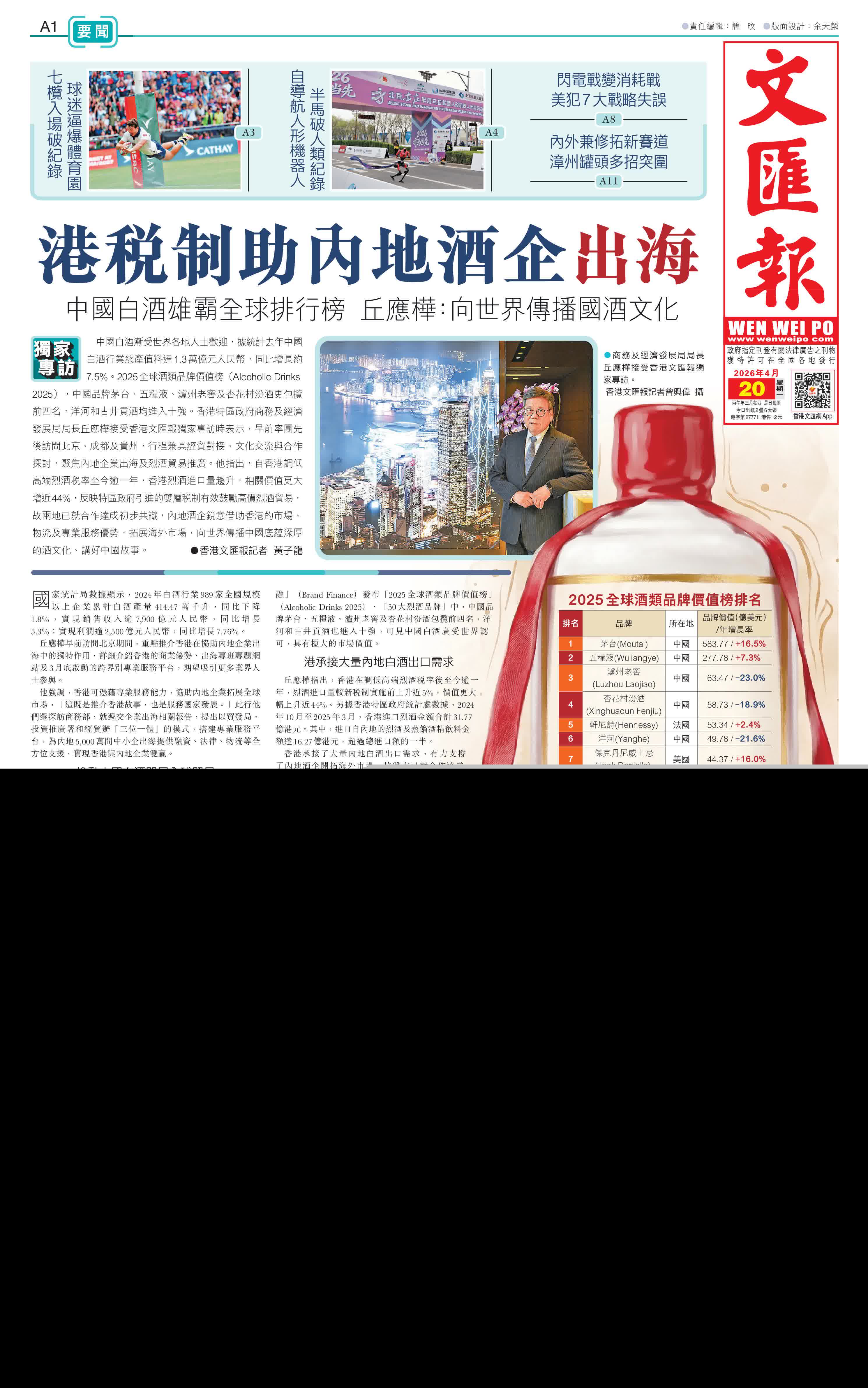 (香港文匯報記者 黃子龍)中國白酒漸受世界各地人士歡迎,據統計去年中國白酒行業總產值料達1.3萬億元人民幣,同比增長約7.5%。2025全球酒類品牌價值榜(Alcoholic Drinks 2025),中國品牌茅台、五糧液、瀘州老窖及杏花村汾酒更包攬前四名,洋河和古井貢酒均進入十強。香港特區政府商務及經濟發展局局長丘應樺接受香港文匯報獨家專訪時表示,早前率團先後訪問北京、成都及貴州,行程兼具經貿對接、文化交流與合作探討,聚焦內地企業出海及烈酒貿易推廣。他指出,自香港調低高端烈酒稅率至今逾一年,香港烈酒進口量趨升,相關價值更大增近44%,反映特區政府引進的雙層稅制有效鼓勵高價烈酒貿易,故兩地已就合作達成初步共識,內地酒企銳意借助香港的市場、物流及專業服務優勢,拓展海外市場,向世界傳播中國底蘊深厚的酒文化、講好中國故事。