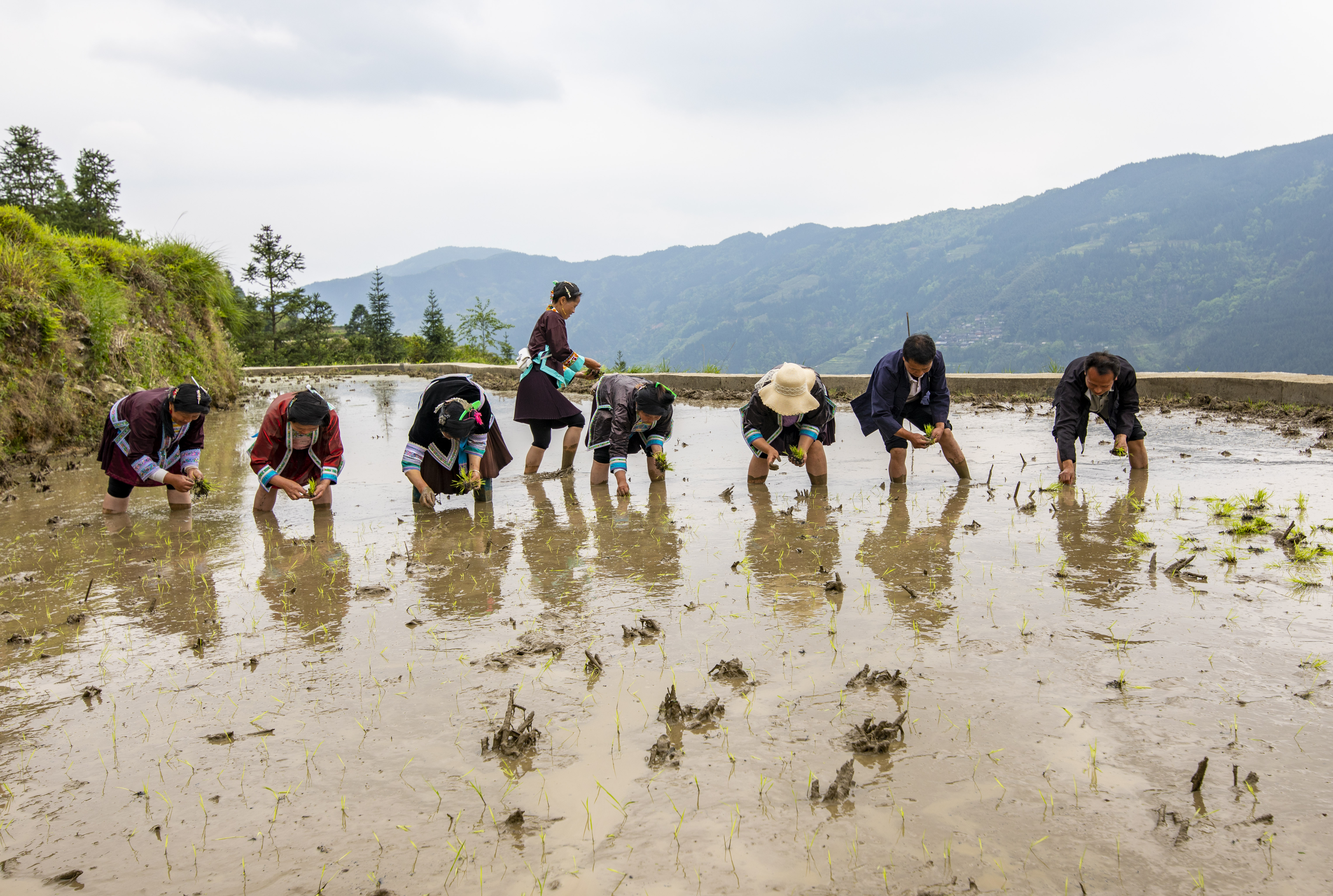 贵州省黔东南苗族侗族自治州从江县加榜乡的农户忙着开展整理秧田、移栽水稻秧苗等农事活动,梯田上一派农忙景象。
