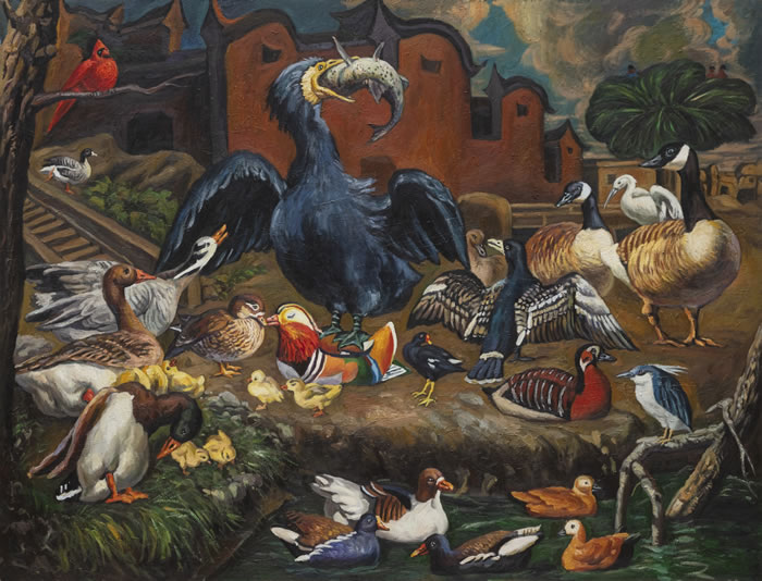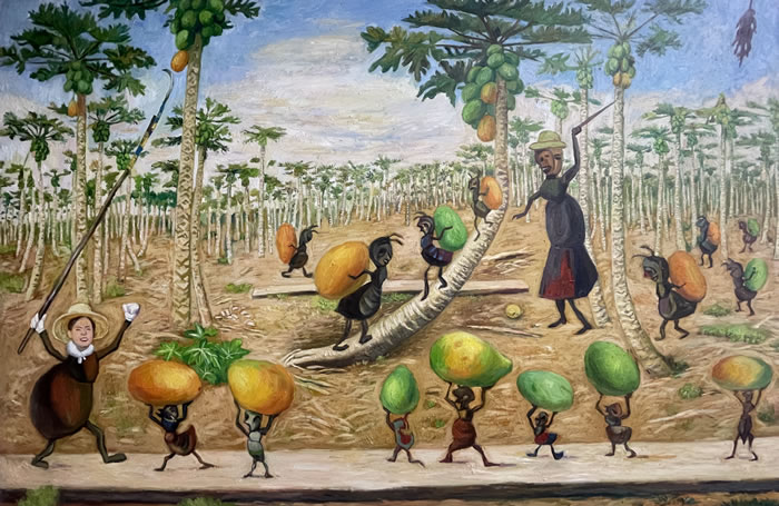 然而,电影并不能解释秦琦作品中多重并置和混合的荒诞感。在一张有两个清代人的画中,画面的 氛围、搬运银子的蚂蚁、远处的喜鹊,又为我们呈现了连环画、插图、年画、中国老电影厂动画片对于秦琦的影响。这些不同的语言与形式、画中人亦真亦假的扮演,制造出故事里的多种层次。