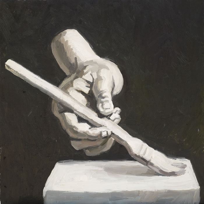 《带刺的画笔》里,秦琦在一盆仙人掌上插满画笔,将其比喻为仙人的手掌,渴望拥有“神来之笔”。“绘画”似乎变得无所不能,可以描绘一切,他在花盆上写下“人无千古醉,诗有万世芳”的浪漫诗句。在展厅的另一边,握着画笔的手,被塑造成一个雕像,接近于某种纪念碑的感受。