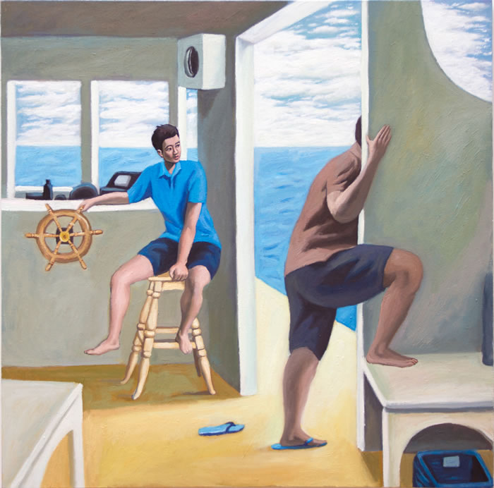 4件作品拥有共同的主题,对现代生活的描绘。和秦琦过往雄壮的历史画不同,它们没有恢弘的场景,也缺少奇特的故事,题材只是聚焦于日常,年轻的女孩,俊朗的少年,明亮的风景,夏日的海滨,有的只是城市里慵懒、放松的中产。某些方面,它们仍保留了异域风情的感受。
