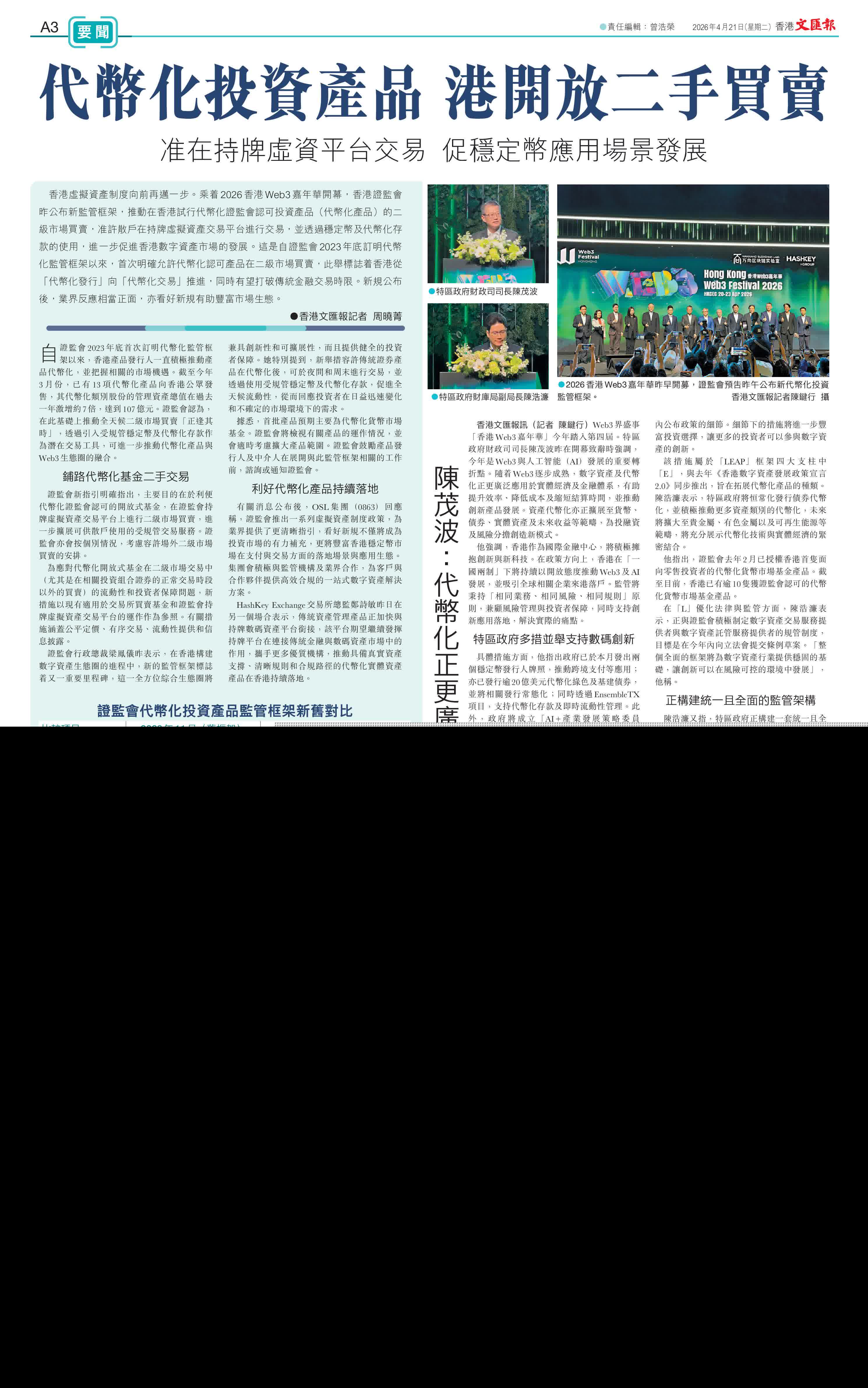 (香港文匯報記者 周曉菁)香港虛擬資產制度向前再邁一步。乘着2026香港Web3嘉年華開幕,香港證監會昨公布新監管框架,推動在香港試行代幣化證監會認可投資產品(代幣化產品)的二級市場買賣,准許散戶在持牌虛擬資產交易平台進行交易,並透過穩定幣及代幣化存款的使用,進一步促進香港數字資產市場的發展。這是自證監會2023年底訂明代幣化監管框架以來,首次明確允許代幣化認可產品在二級市場買賣,此舉標誌着香港從「代幣化發行」向「代幣化交易」推進,同時有望打破傳統金融交易時限。新規公布後,業界反應相當正面,亦看好新規有助豐富市場生態。