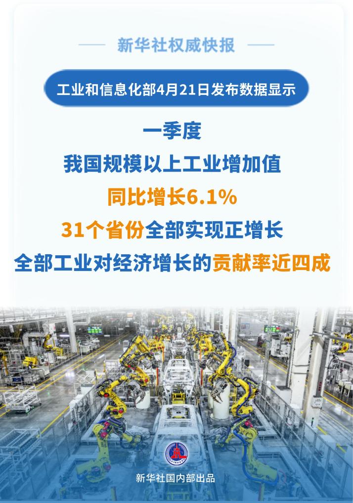 工业和信息化部4月21日发布数据显示,一季度,我国规模以上工业增加值同比增长6.1%,31个省份全部实现正增长,行业增长面超八成,全部工业对经济增长的贡献率近四成。