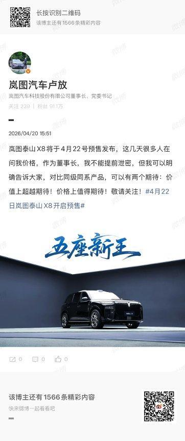 【2026年4月20日,武汉】4月20日,岚图汽车董事长卢放通过个人社交平台发文回应价格猜测,明确岚图泰山x8价值上超越期待,价格上值得期待,引发大量媒体热议。