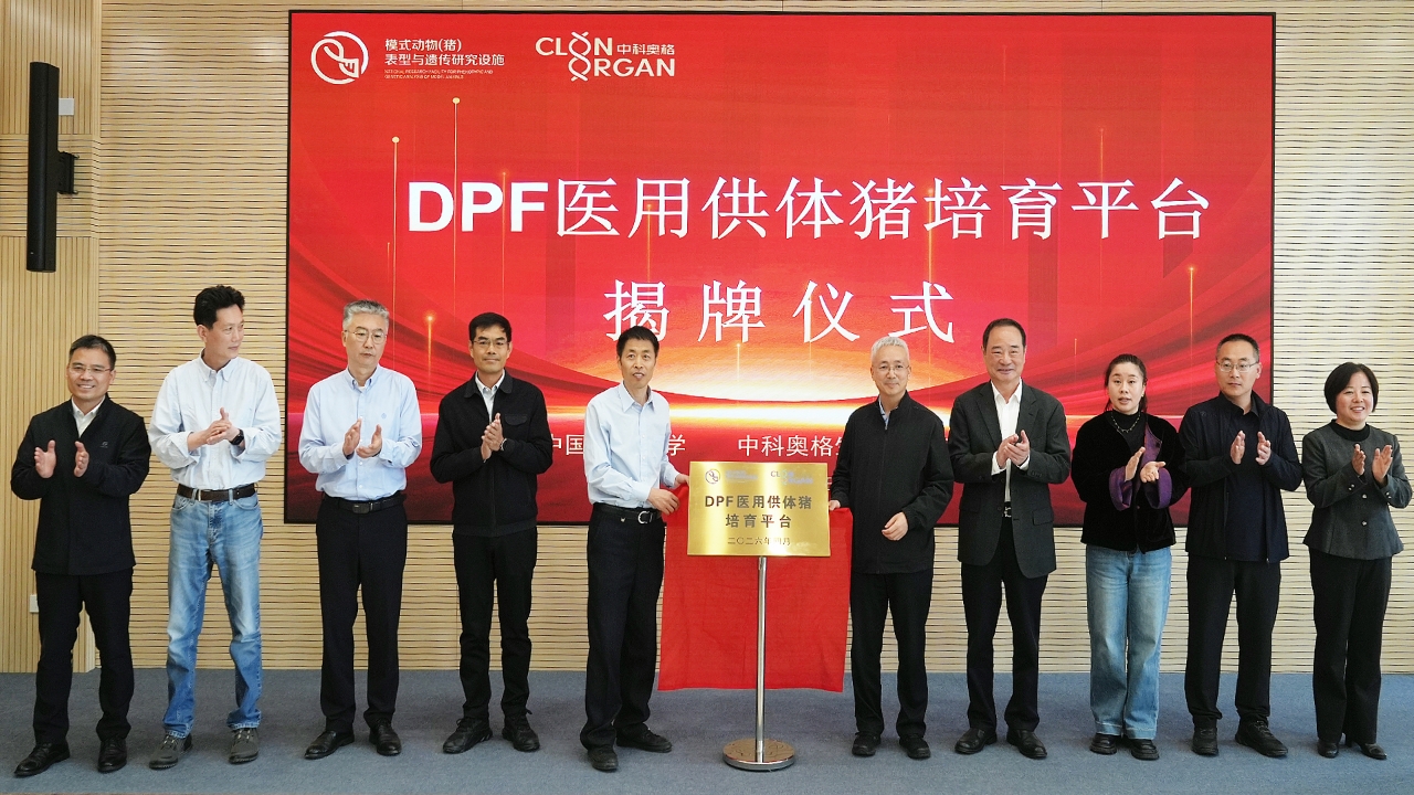签约现场,双方共同为“DPF医用供体猪培育平台”揭牌。该平台将面向全国医疗机构、科研院所及生物医药企业开放共享,提供医用供体猪培育、质量评价、标准化供应等一体化服务,同时作为联合人才培养基地,助力生物医药领域高层次工程技术人才培养。