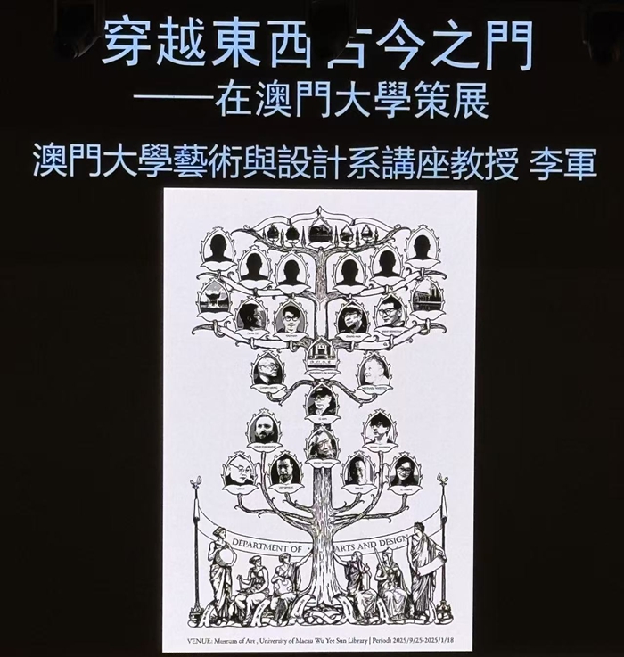 李军本次分享主题为《穿越东西古今之门》,他选择自己为澳门大学艺术与设计系的教师作品展《知识树:基于伟大的创造》创作的主题海报作为开篇,生动诠释学术理想的同时,也表达了对澳门文化交融的理解。海报中,14位教师如同生长在不同枝桠上的花果,6条根系则分别对应“东方与西方、古代与现代、创作与研究”三组坐标,象征着这棵扎根澳门的知识树,以东西古今的多元文化为养分,在继承与创新中生长,也呼应了他所提出的“澳门是连接大陆与海洋、沟通东西古今的门户”这一观点。