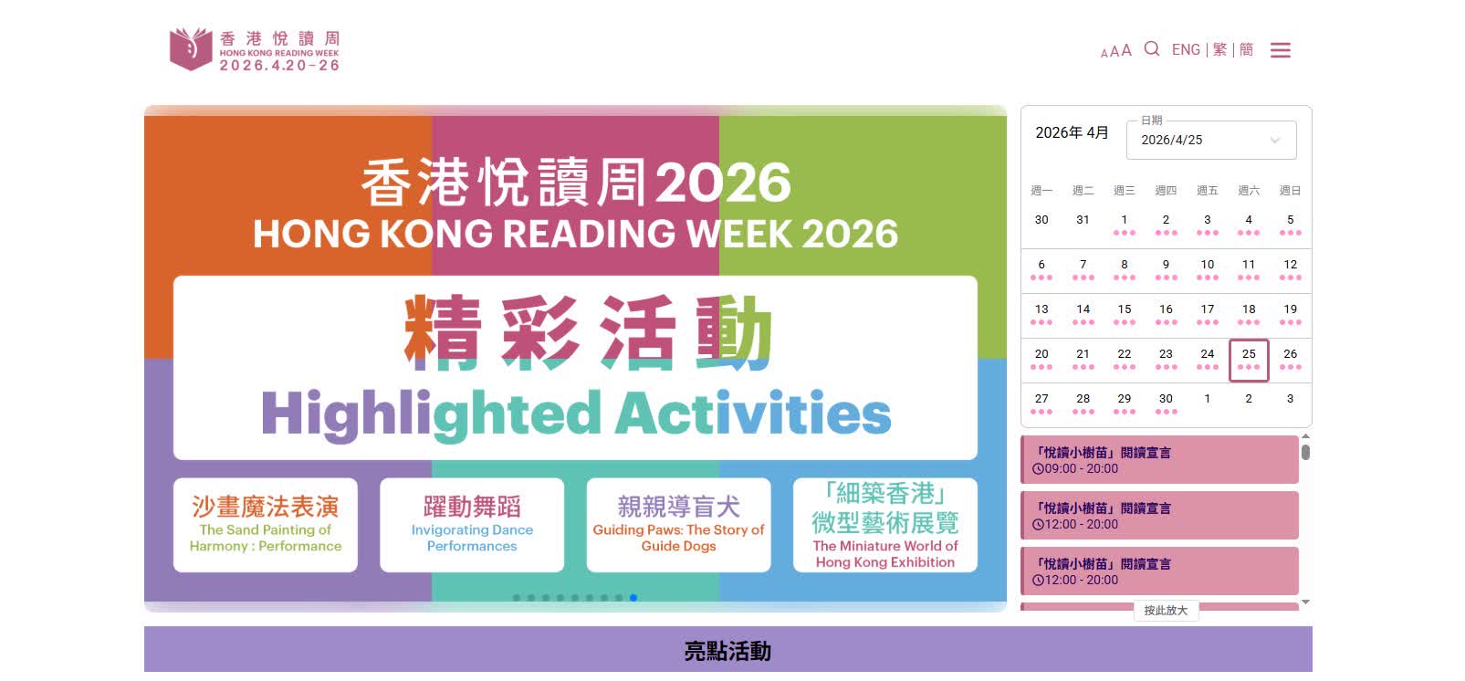 此外,「快閃圖書館@香港悅讀周2026」將以「幸福,『BOOK』見不散」為主題,於明日上午11時至晚上7時在九龍塘又一城商場舉行。市民可以在現場欣賞無伴奏合唱和樂團表演、聆聽故事大使說故事、以虛擬實景裝置親歷經典名著,及體驗專業治療犬帶來的動物輔助伴讀。全港各區的指定公共圖書館,亦會在明日及星期日舉行多個故事及手工藝工作坊,而部分指定圖書館亦會設置自助攝影攤位,讓讀者在活動的歡樂氛圍中享受閱讀。